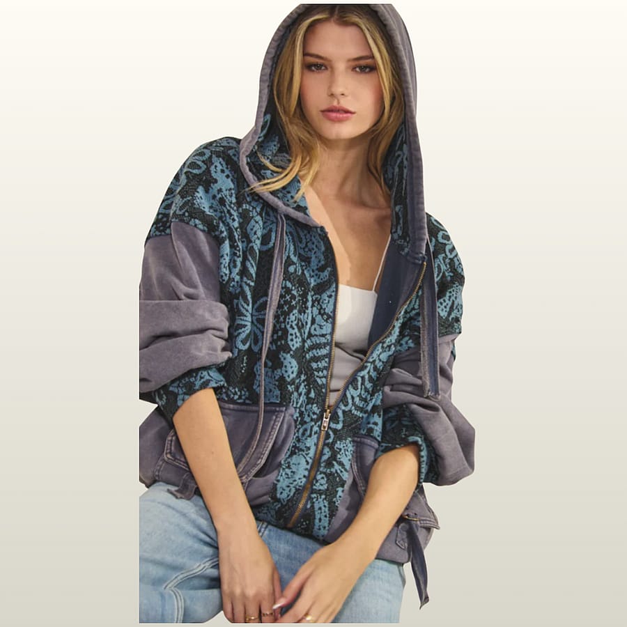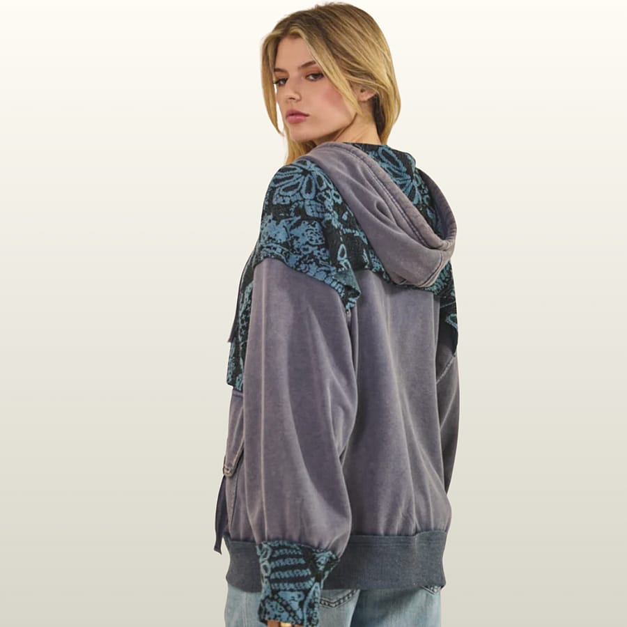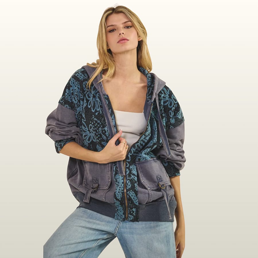 Washed Printed Patterned Contrast Hooded Jacket - Imported - Mineral Wash Detail - Relaxed Fit - True To Size - Fabric Content: Self: 53% Cotton, 47% Polyester Cont: 60% Acrylic 40% POLYESTER