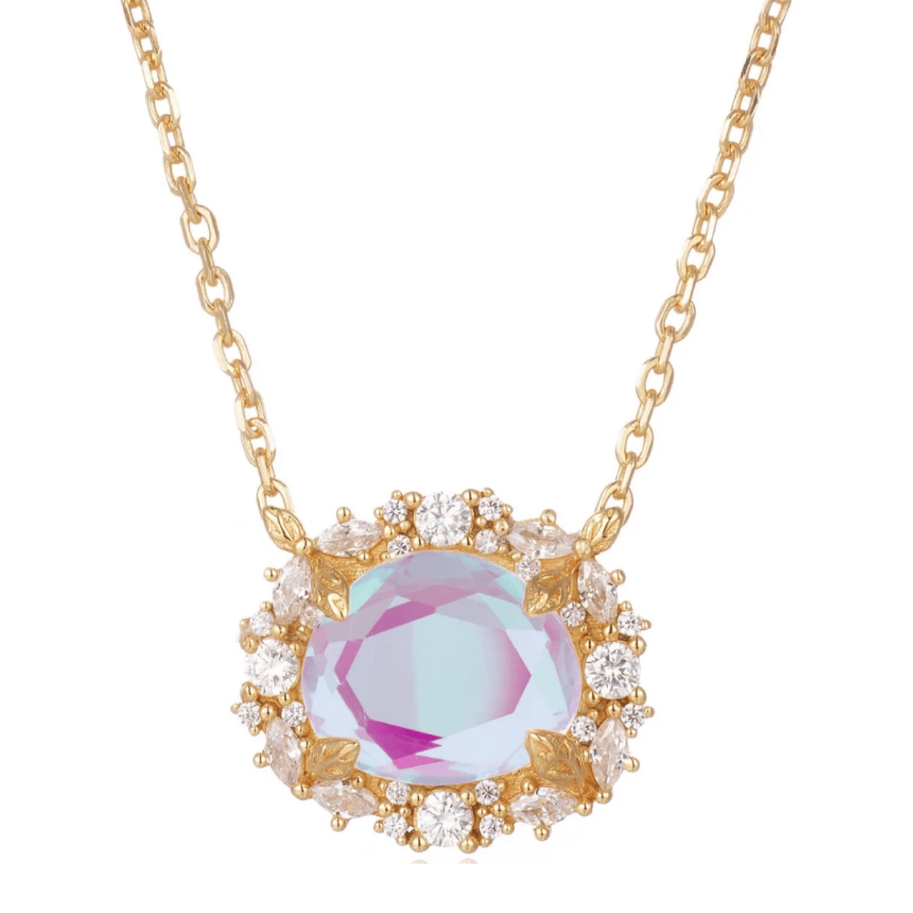 The Poppy Necklace is a shimmer of sparkle and perfect for layering. It features your choice of stone; dichroic glass, created emerald, Kyocera opal. The floral halo of crystals and leaf elements add to the beauty. The setting and chain is made of high quality 14k Gold Vermeil, which is a thick layer of gold over a sterling silver. It will not rust or tarnish and will stay beautiful for years to come if cared for properly.