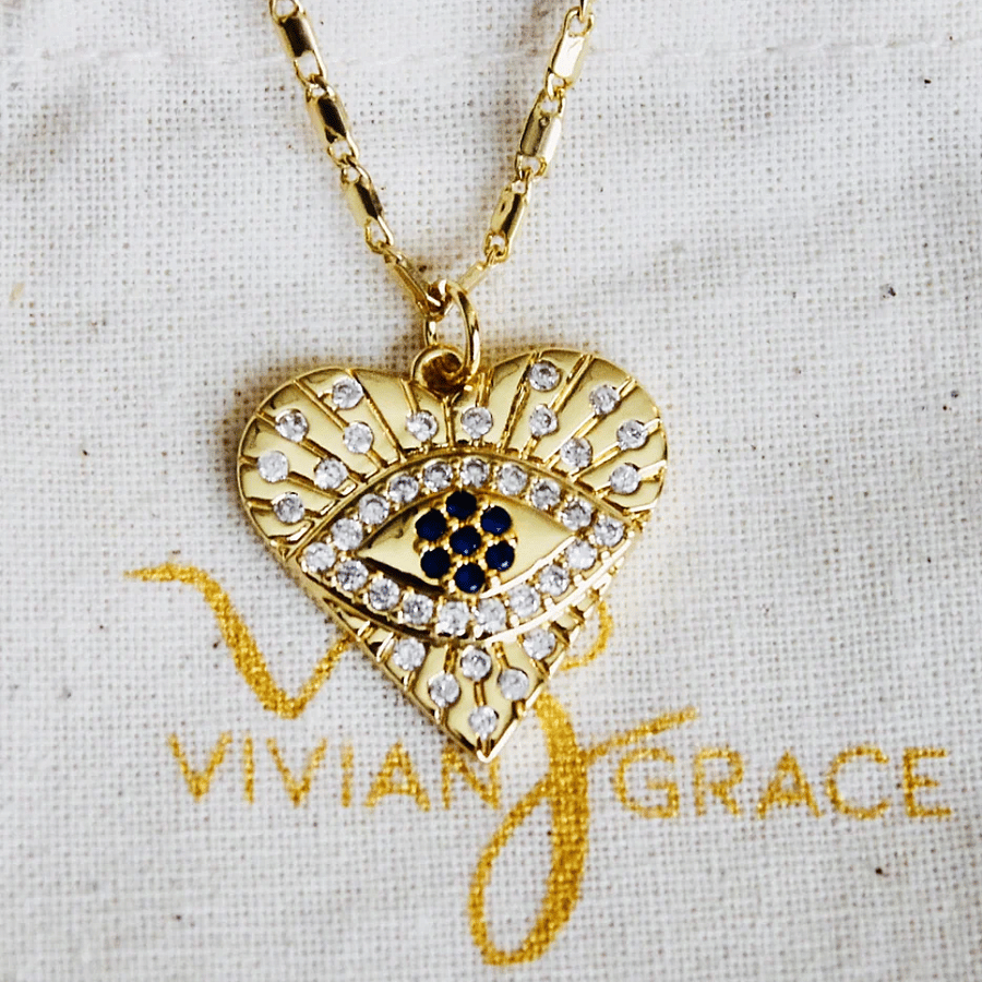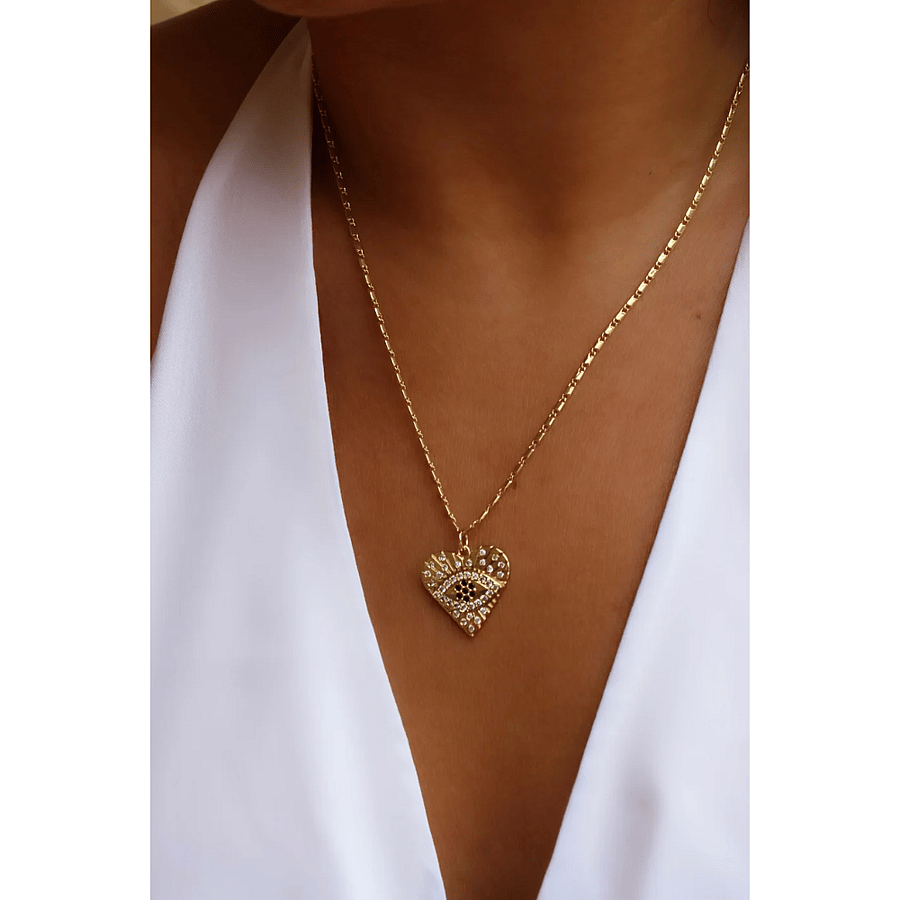 The Evil Eye Heart Necklace features a medium sized heart tag pendant with sparkly crystals on a unique gold-filled flat chain.
