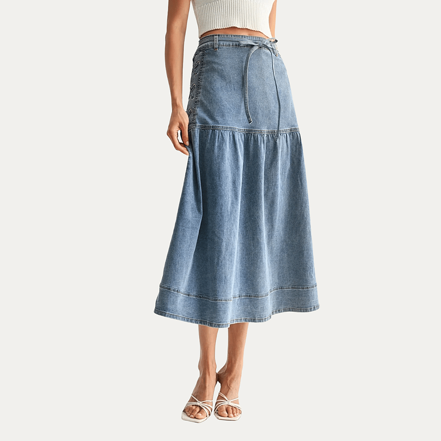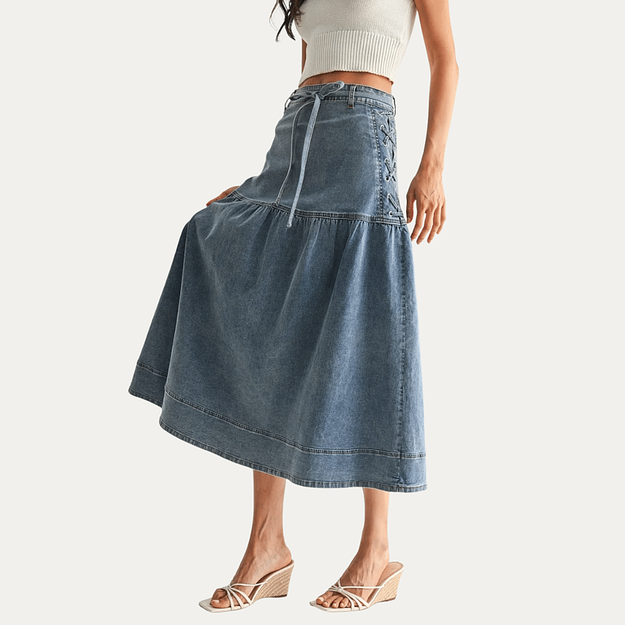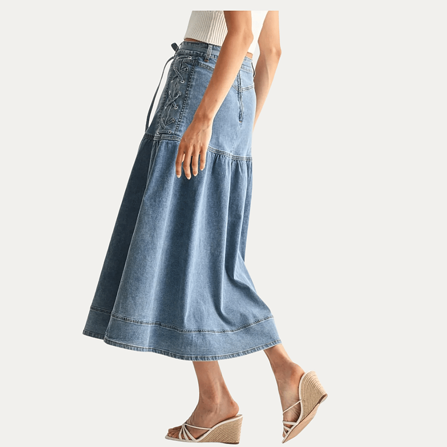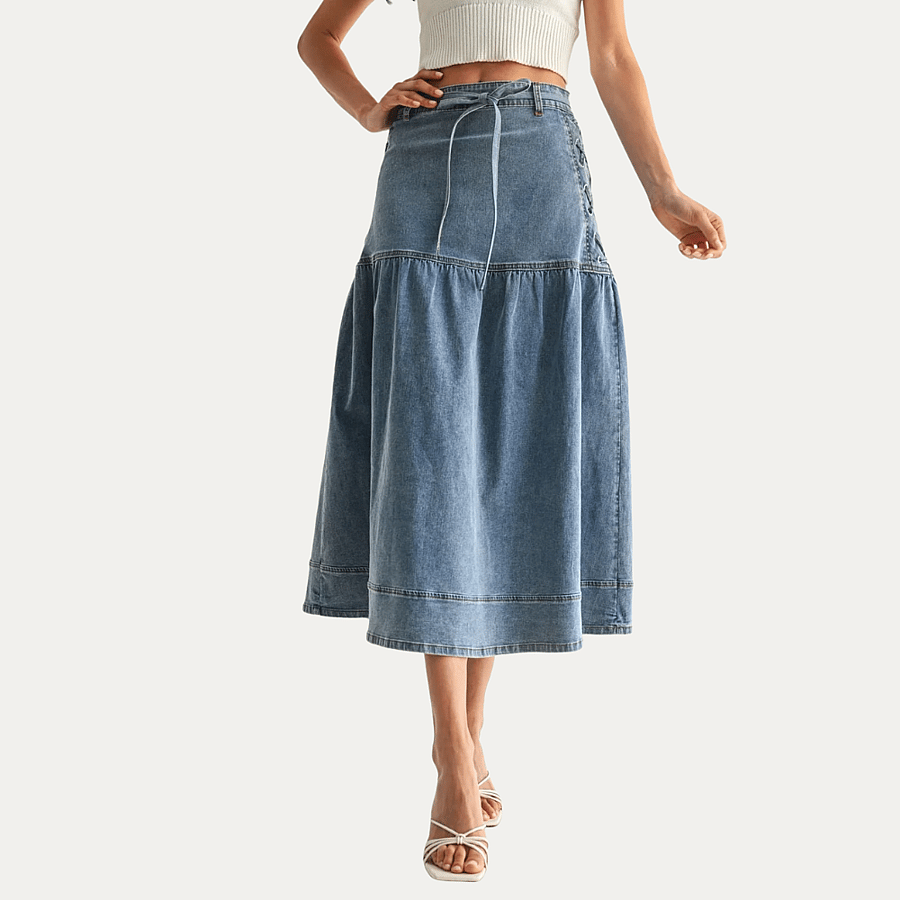 Explore a perfect blend of elegance and functionality with our Denim Midi Skirt, designed for a sophisticated yet casual appearance. Crafted from premium denim, this skirt offers both durability and comfort, making it an ideal choice for the modern professional. Its unique lace-up detailing adds a fashionable touch, ensuring you stand out in any setting.
