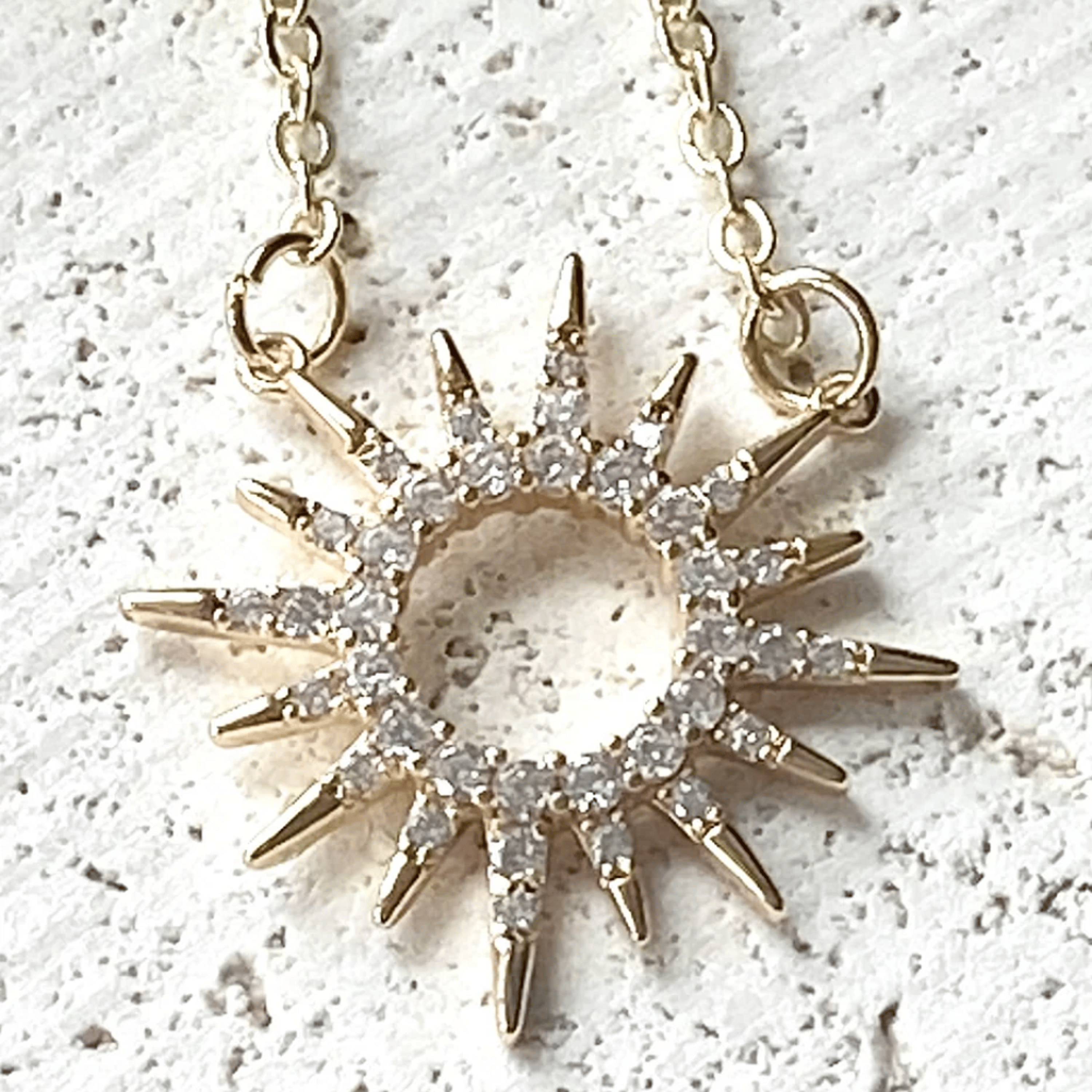 This simple sparkly dainty necklace is sure to be a customer favorite. Non tarnishing gold chain micro pave clear crystal. 2 loop 23mm sun. 17" Chain