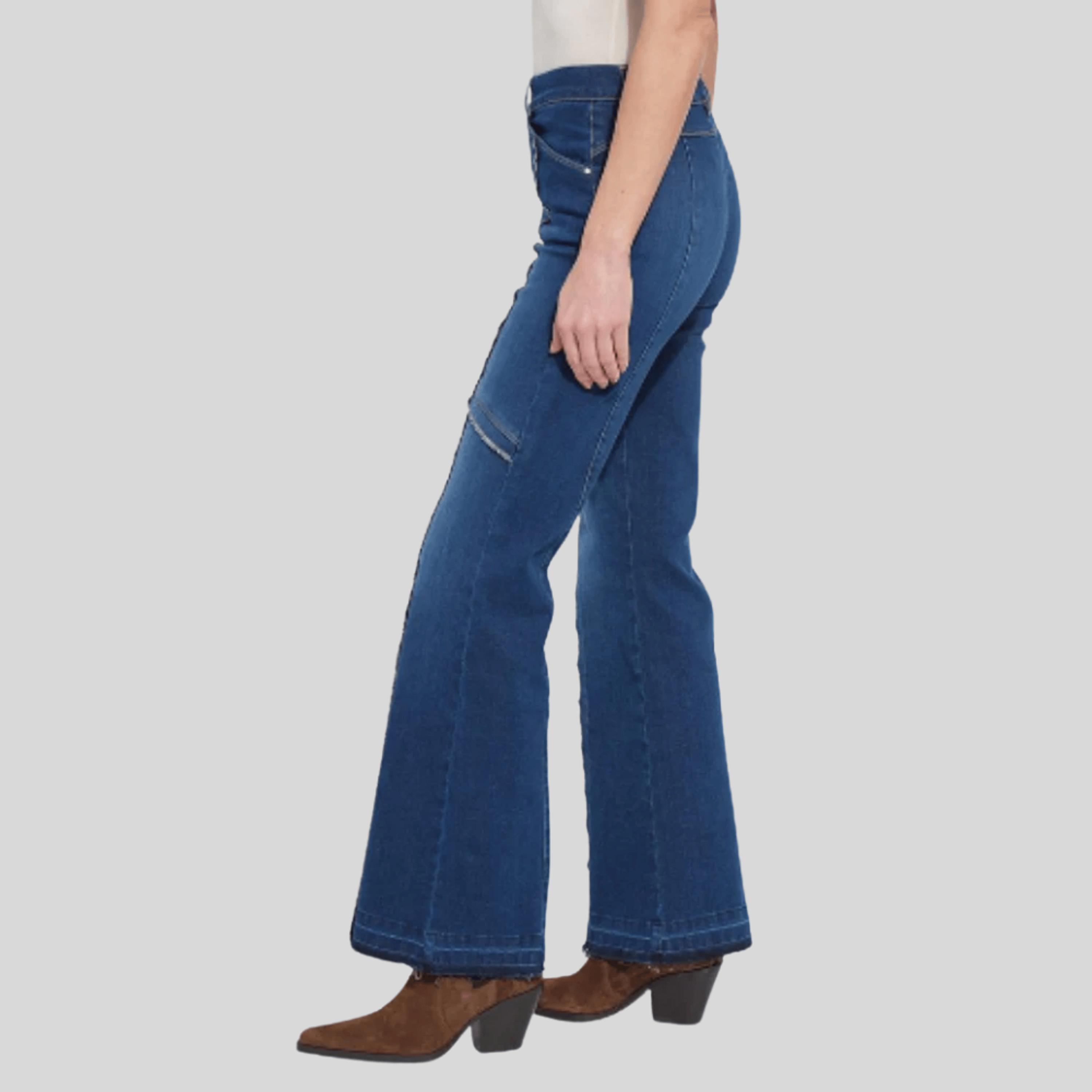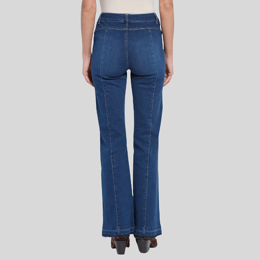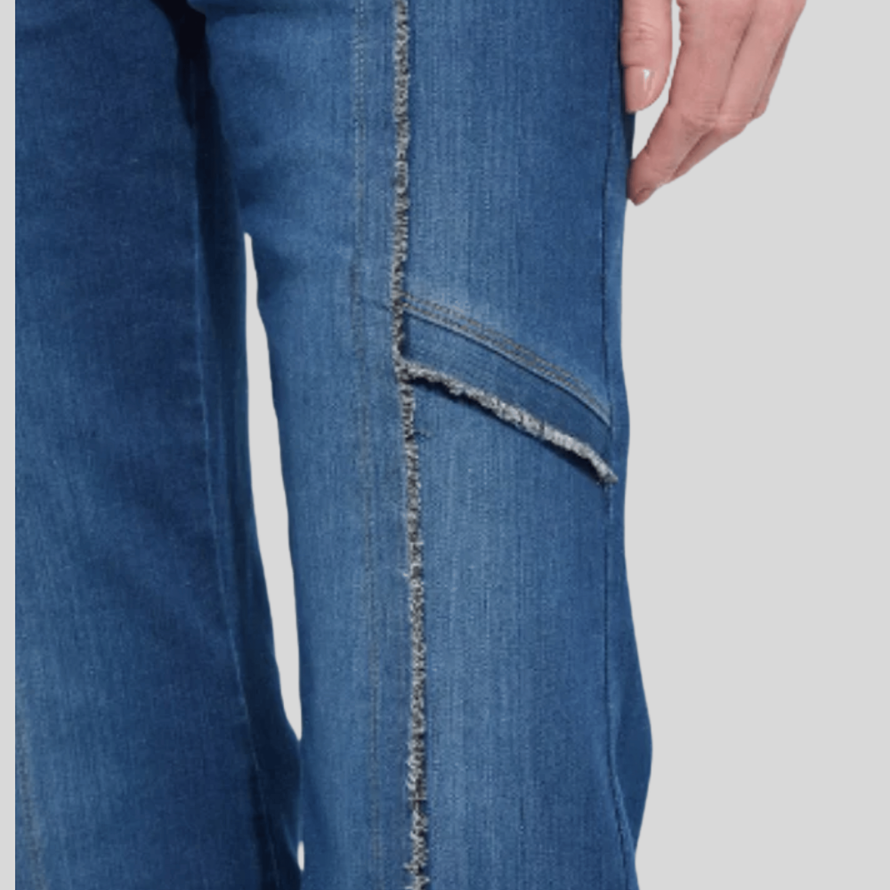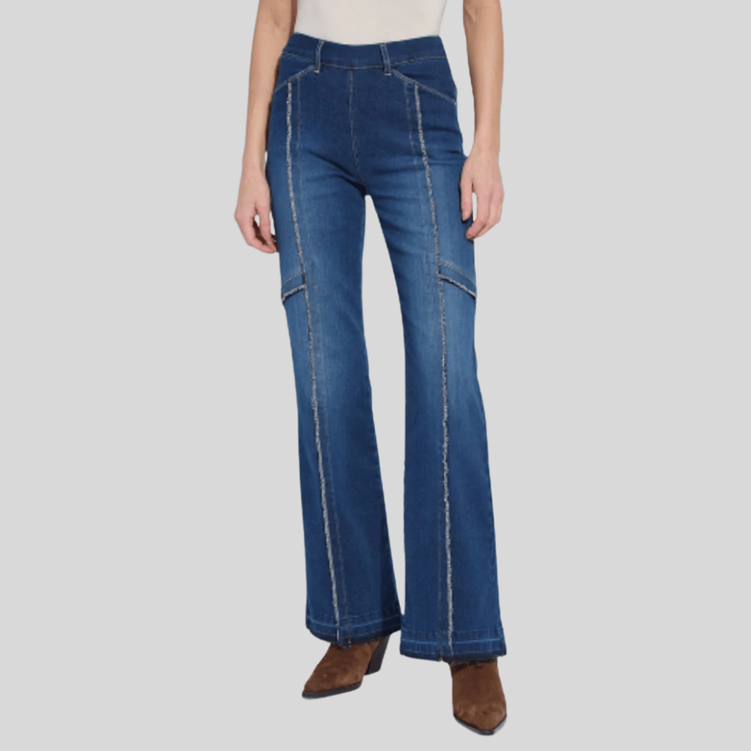 A modern take on classic denim—these Lyssé Felicity trousers feature a flattering high-waist silhouette with wide legs and statement-making raw fringe hem. Detailed with vertical seaming and edgy exposed raw-edge piping down the front and across the thigh, these jeans elongate the legs and add visual interest. Crafted from Lyssé’s signature stretch denim for all-day comfort and shape retention. Flatter from every angle in these very unique trousers!