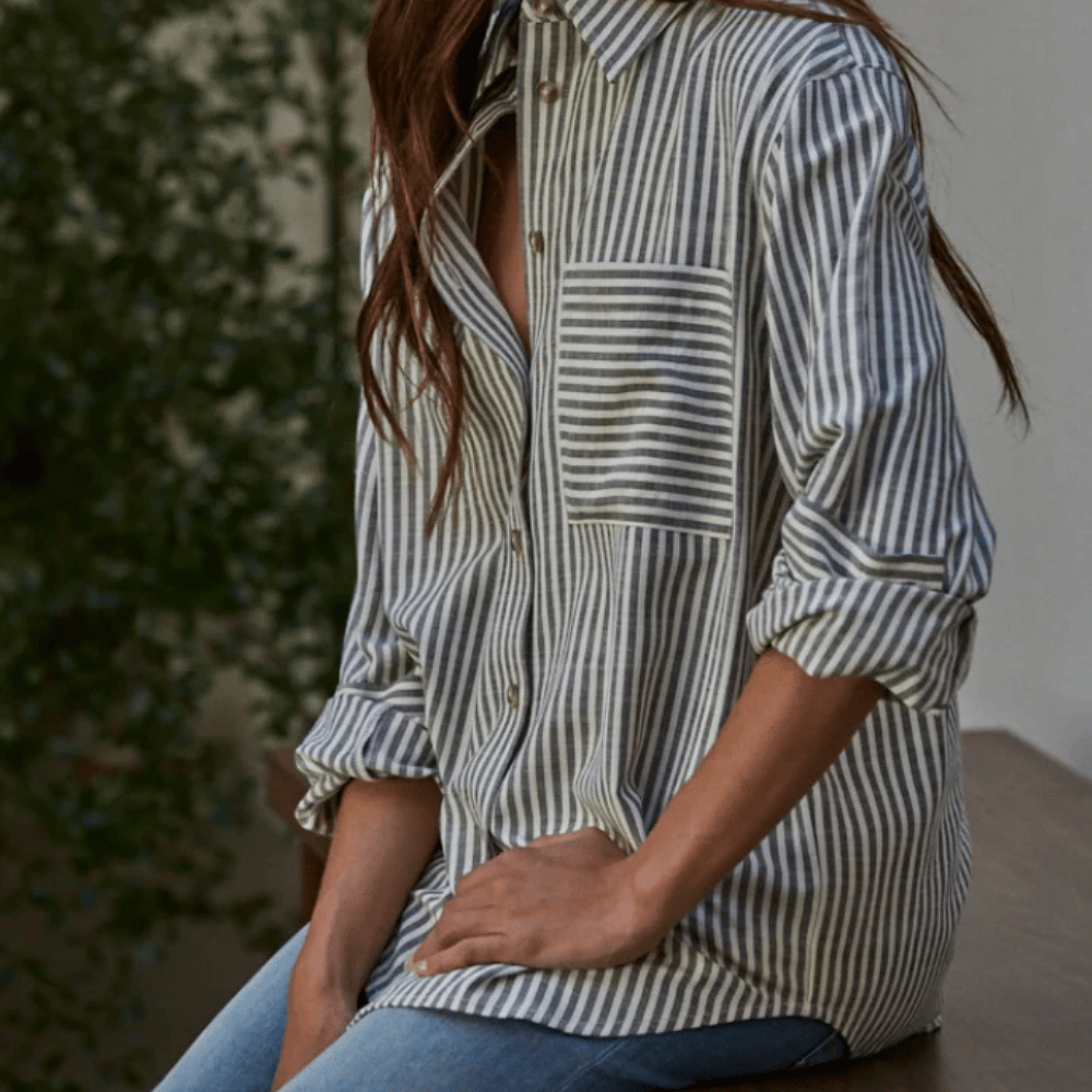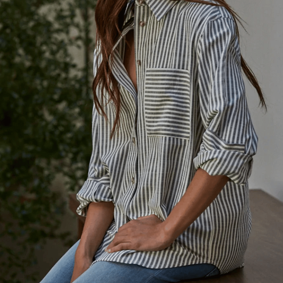 Woven Cotton Collar Neck Button Front Long Sleeve Front Chest Pocket Top