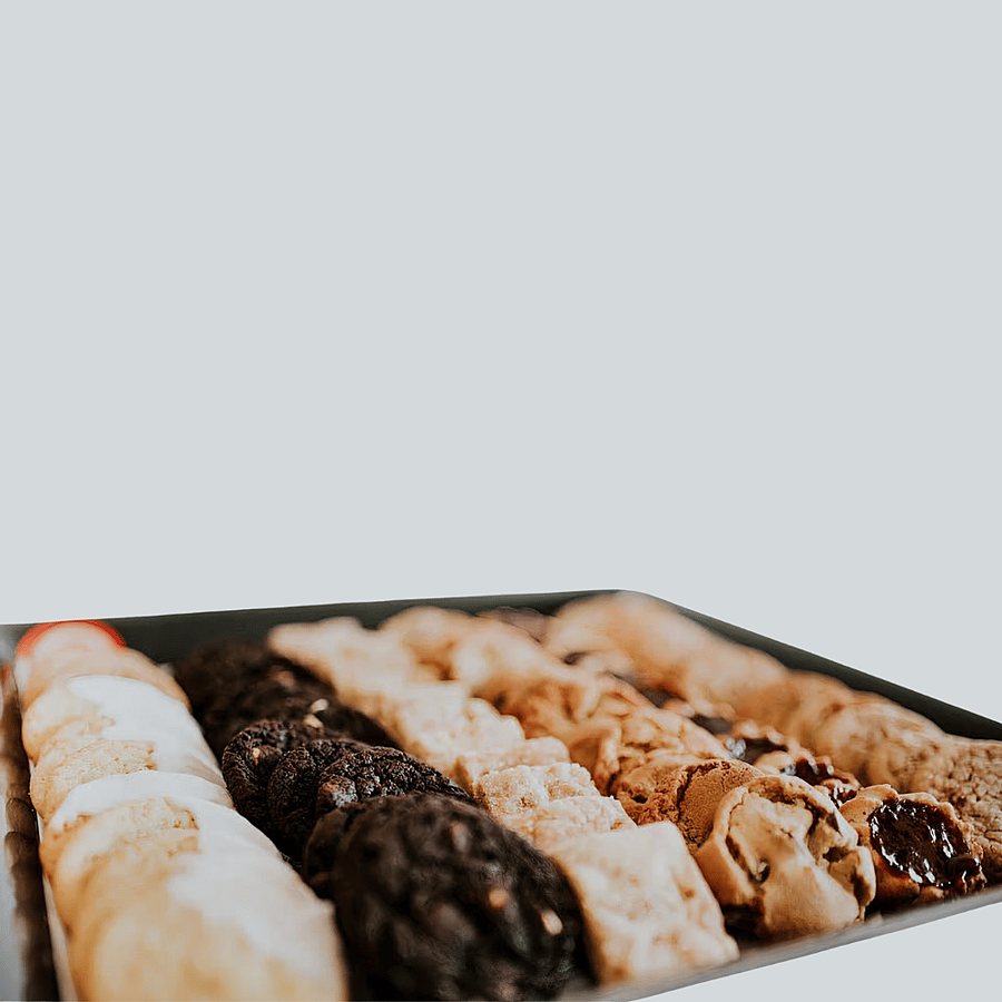 80 cookies: five different flavors. Serves 25-40 people. The perfect addition to your office meeting! Served on an elegant black catering tray. Plastic rigid cover for easy transportation and storage. All natural using local and organic ingredients. Taste the difference!