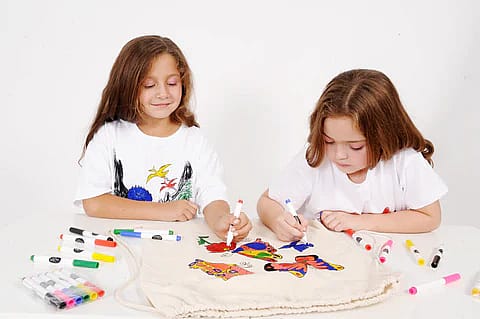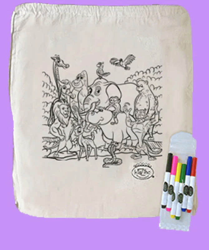 100% Natural Canvas Drawstring Tote Backpack. 19.5 " x 16.5" comes with a set of 6 non-toxic washable markers. Exclusive design "Wildlife".