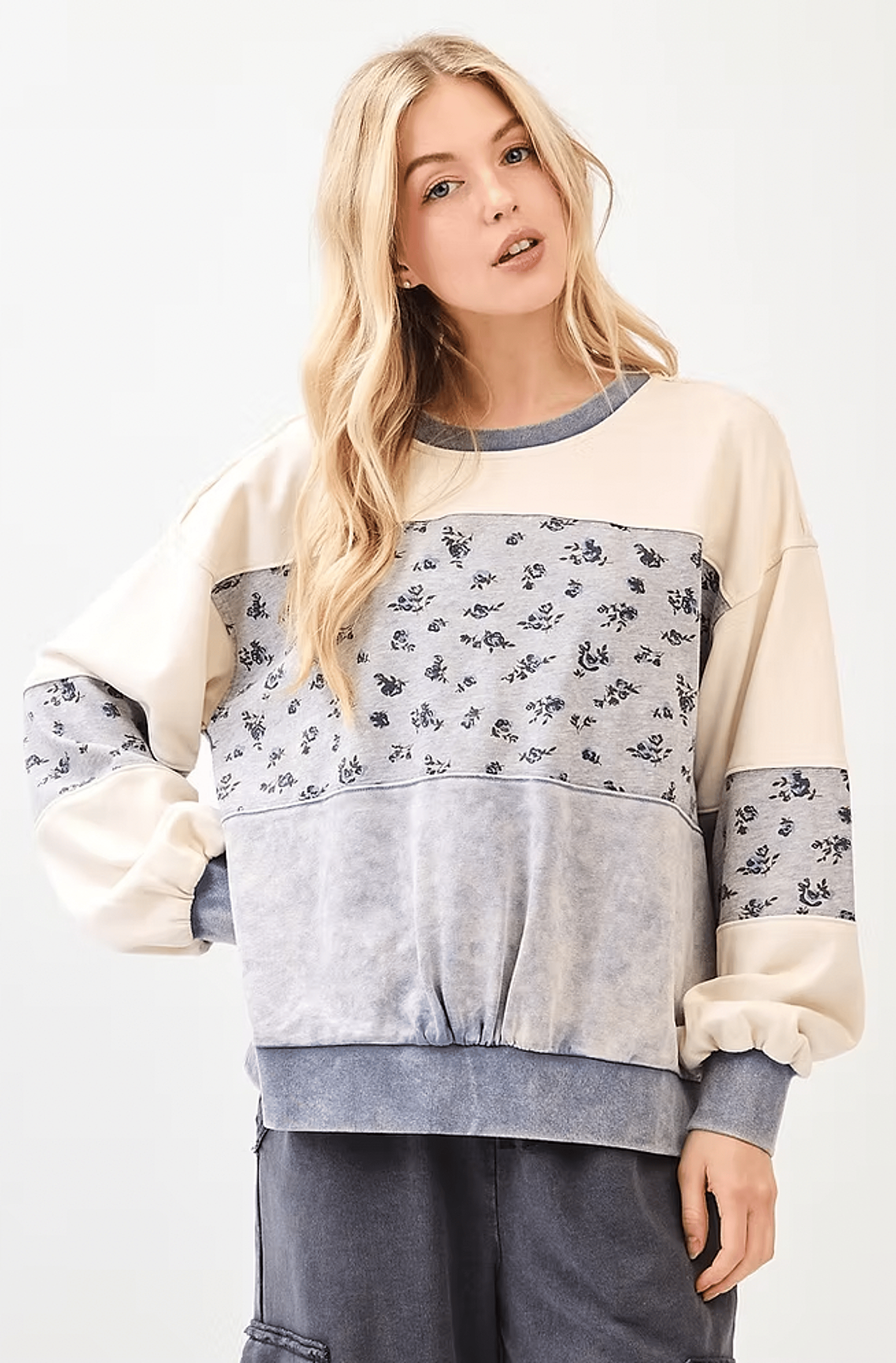 Add a vintage-inspired touch to your wardrobe with this effortlessly stylish pullover. Featuring a soft acid-wash finish and delicate floral print, this top combines laid-back comfort with feminine detail. The relaxed fit and lightweight fabric make it perfect for everyday wear—whether you’re lounging at home, running errands, or pairing it with jeans and sneakers for an easygoing look.