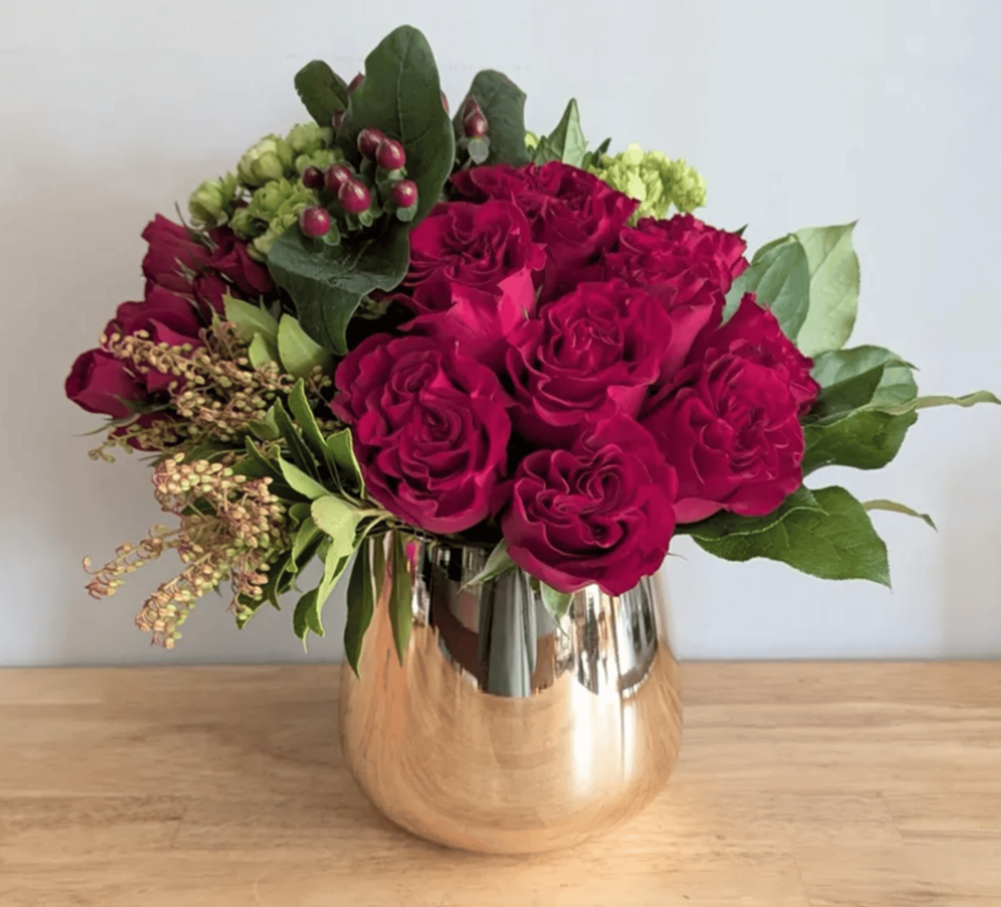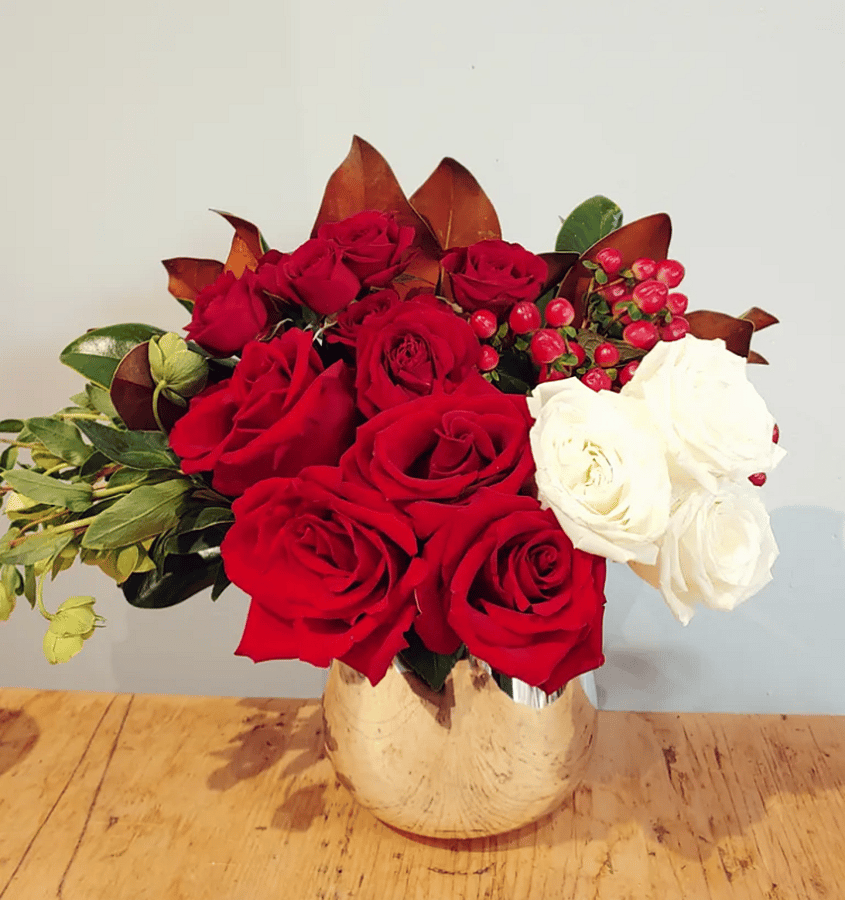 Abundant arrangement of hellebores, red roses, red spray roses, green hydrangea and red hypericum berries with Magnolia leaves arranged in a 6 Inch silver mercury glass vase. Flowers may vary slightly depending on availability.