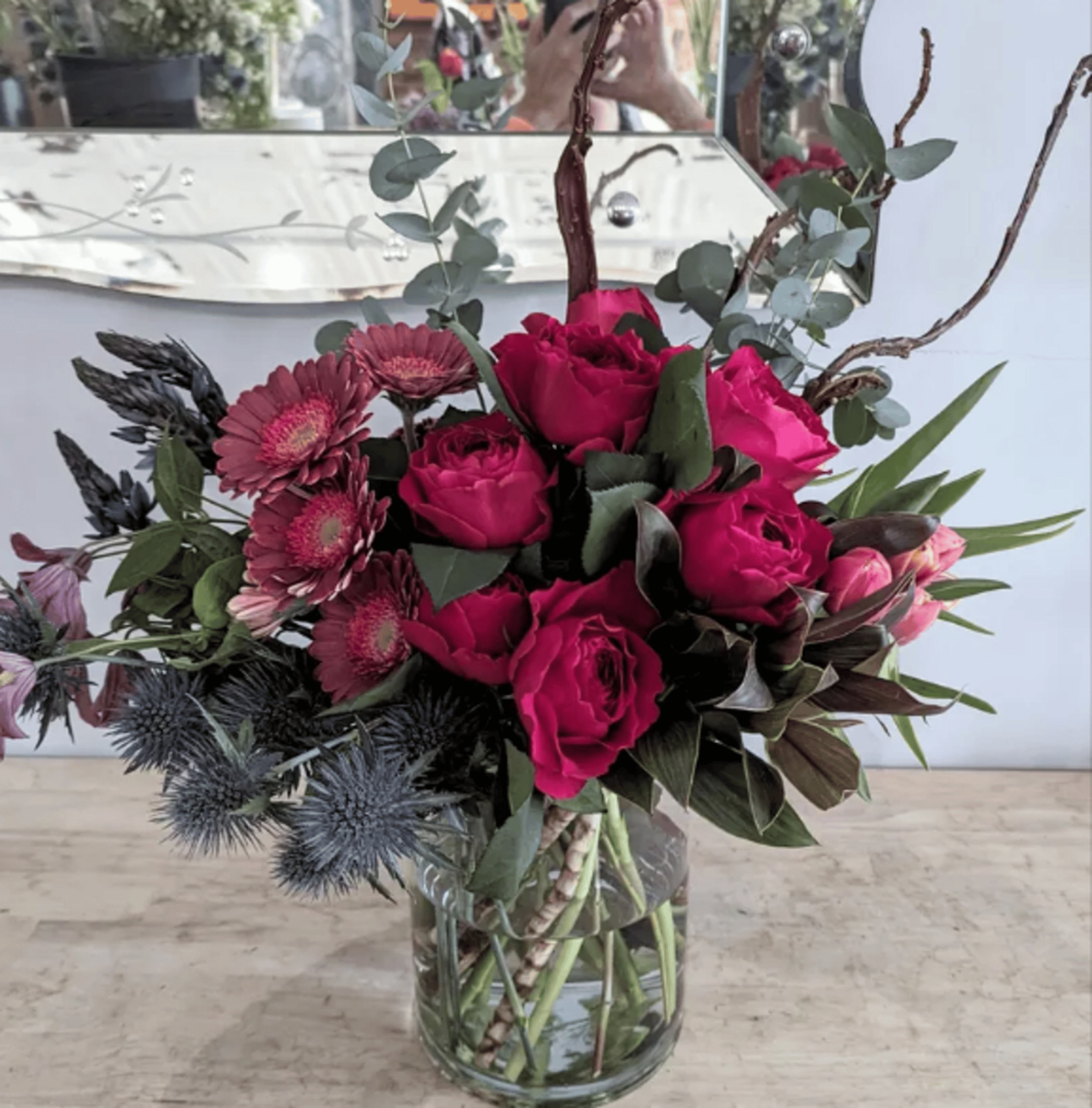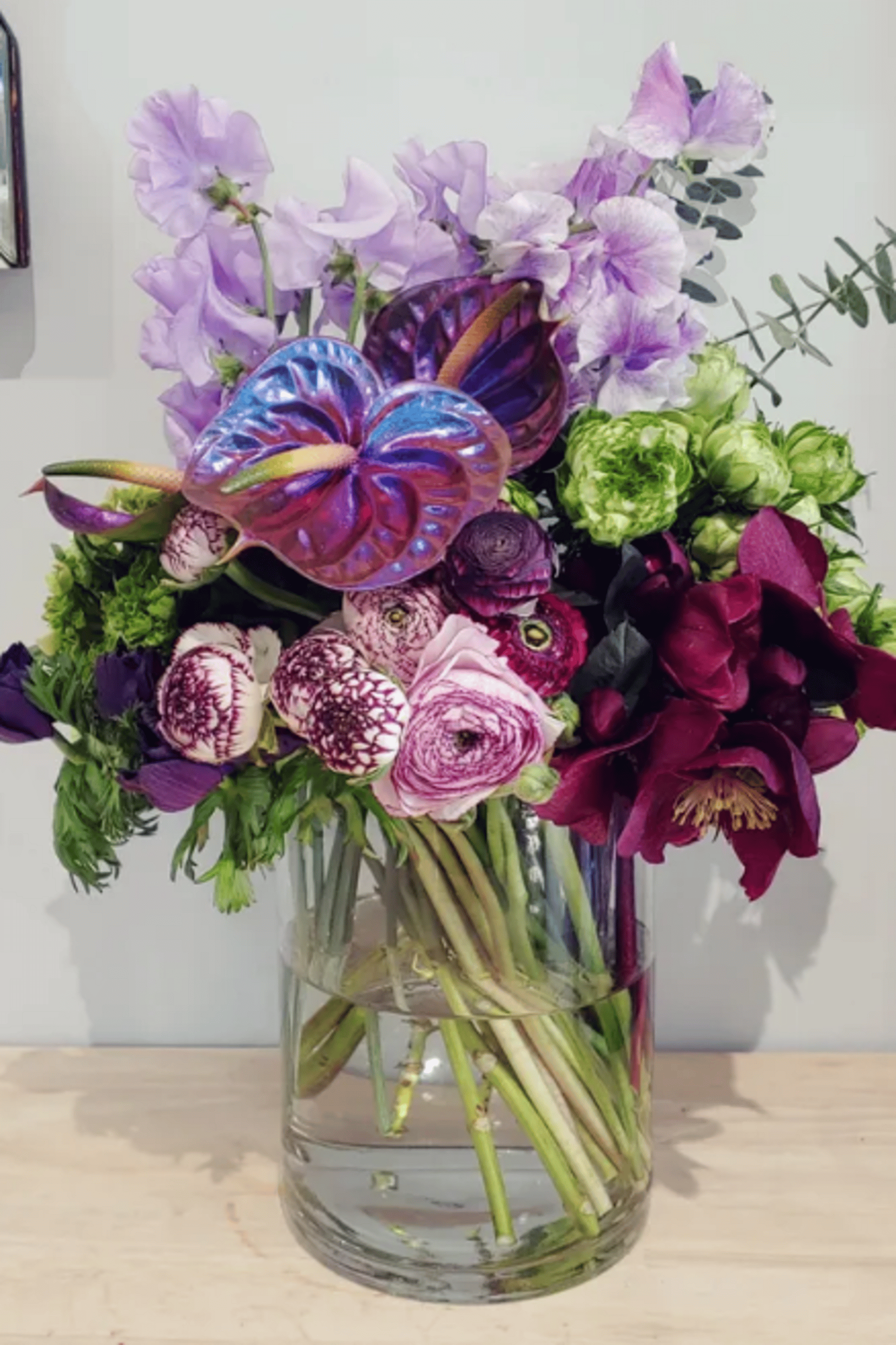 This beautiful arrangement includes sweet peas, hydrangea, garden roses, hellebores, hand-painted anthurium and ranunculus all in a 6" wide x 8" tall clear glass vase. Flowers may vary by season and substitutions will be made, but color palette will be the same - dark purples, burgundy, light green & lavender