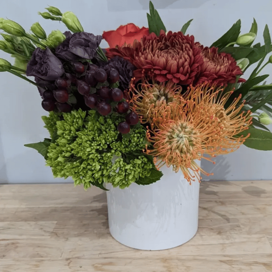 A beautiful arrangement of colorful fall flowers artfully arranged in a 5" x 5" matte white ceramic vase. Flowers will vary based on daily availability but don't stress - we've got this.