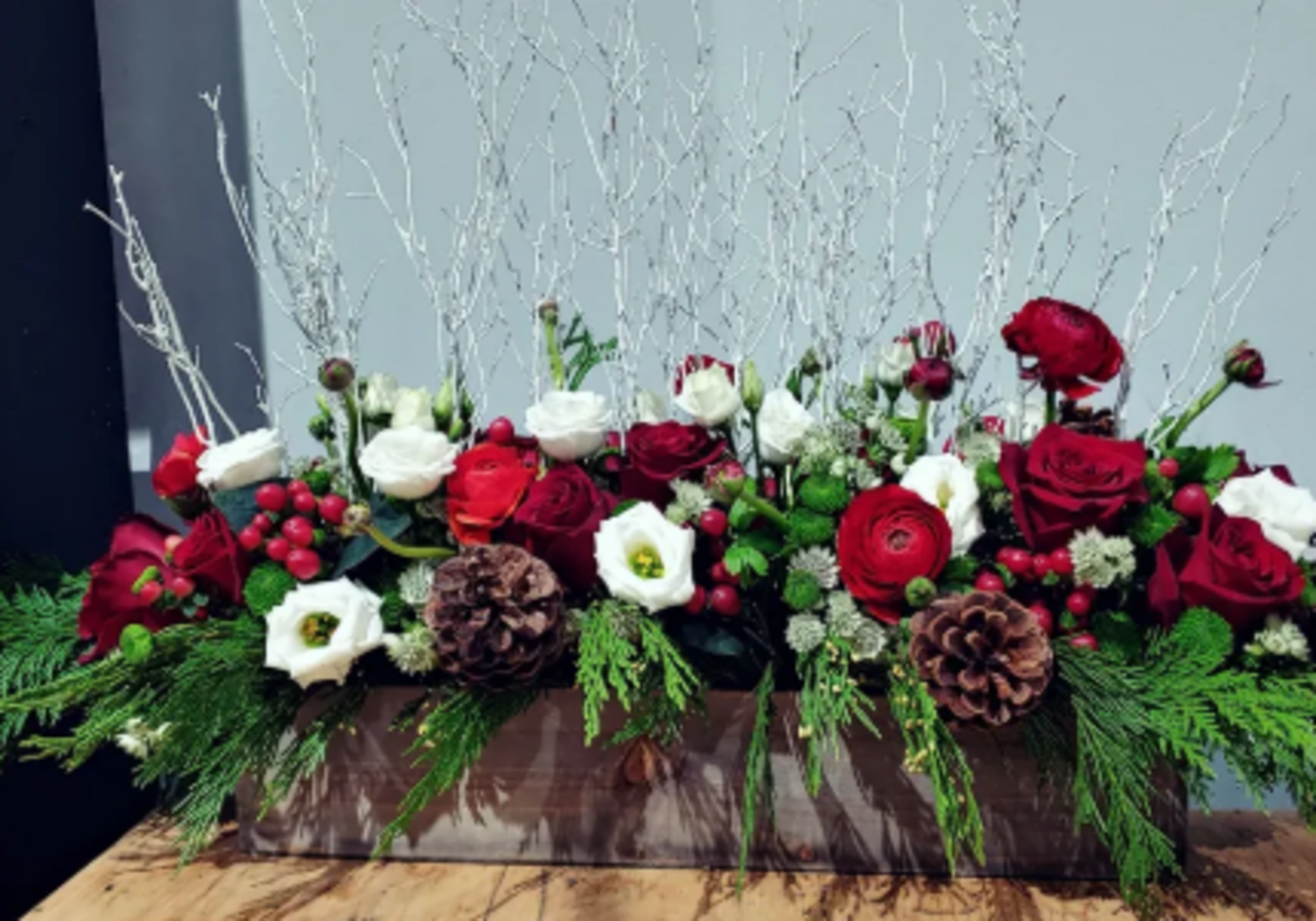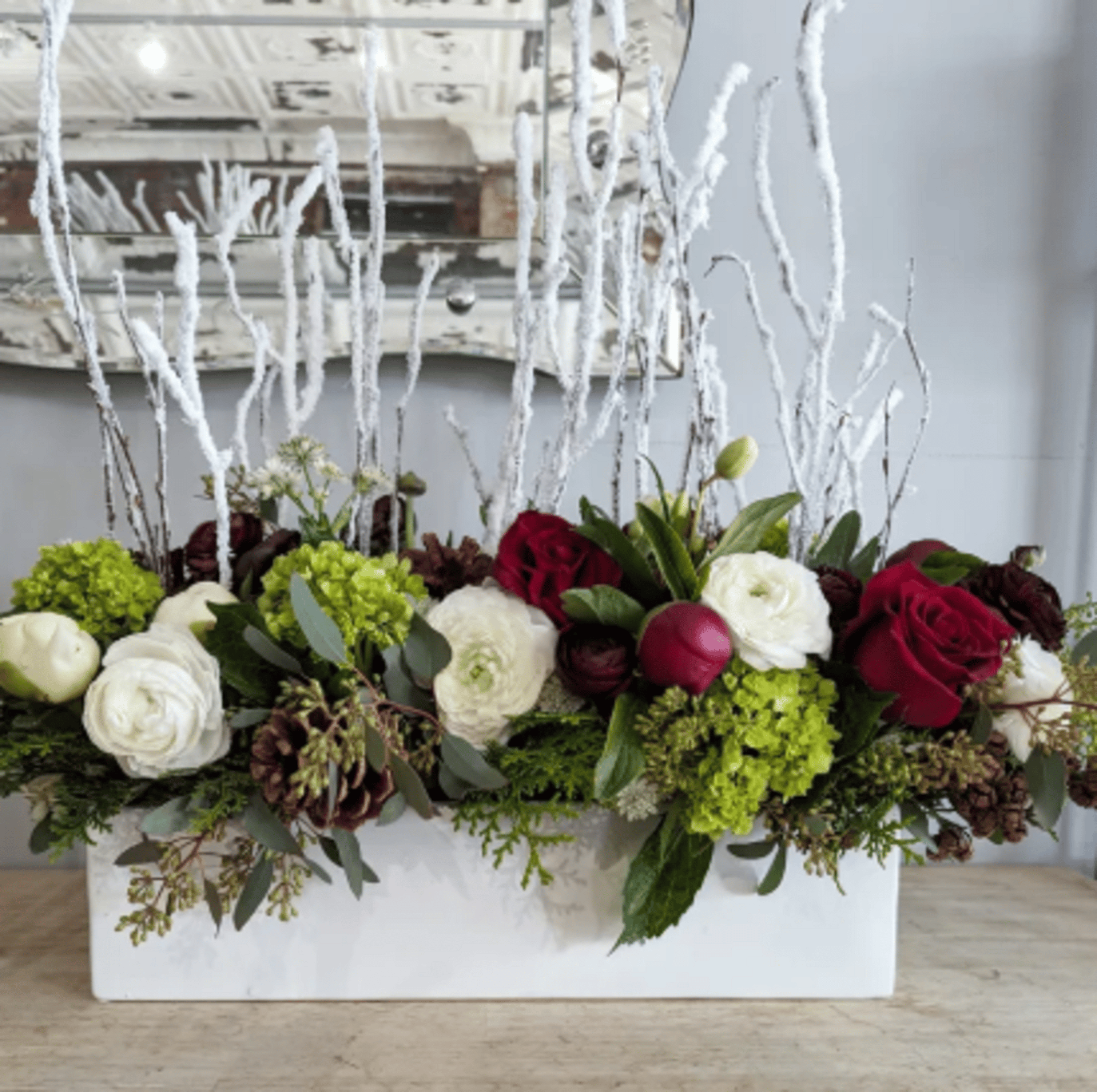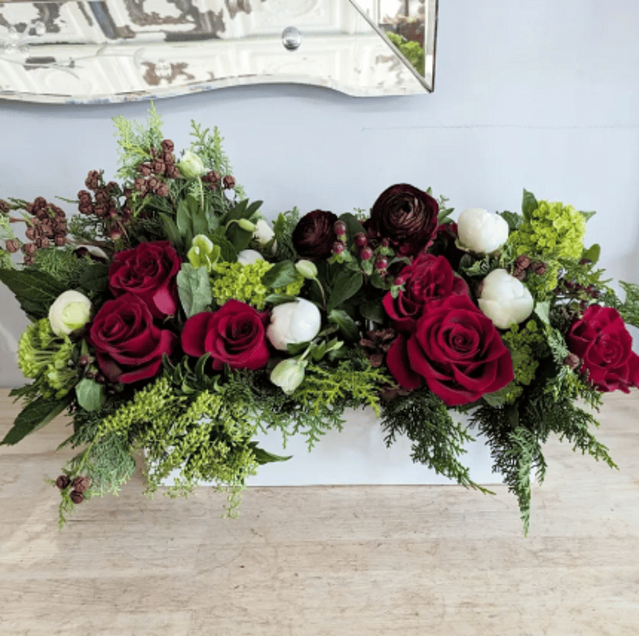 This beautiful long and low centerpiece arrangement contains a variety of seasonal flowers, greens, pinecones, berries and branches to make your table merry and bright. Flowers will vary based on availability but color palette will remain the same. Ceramic low container will be substituted when wooden boxes aren't available.