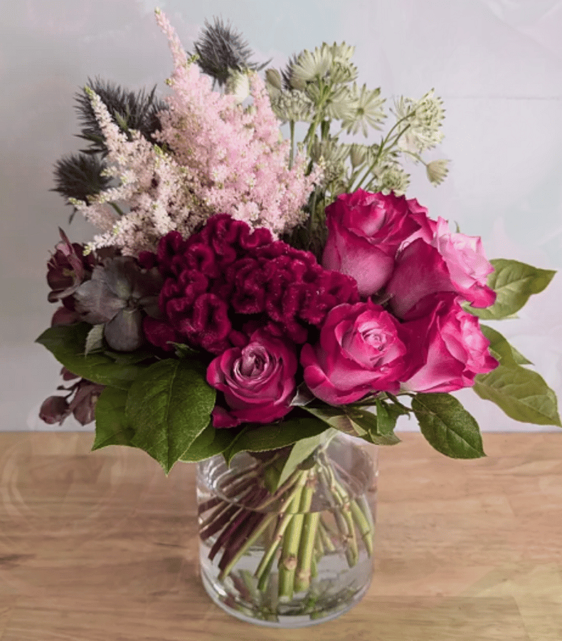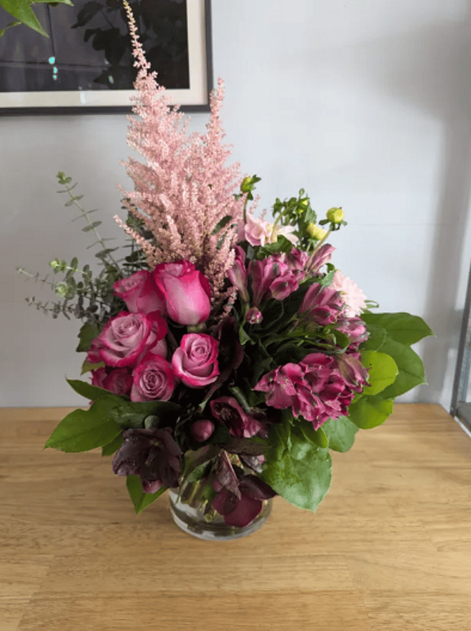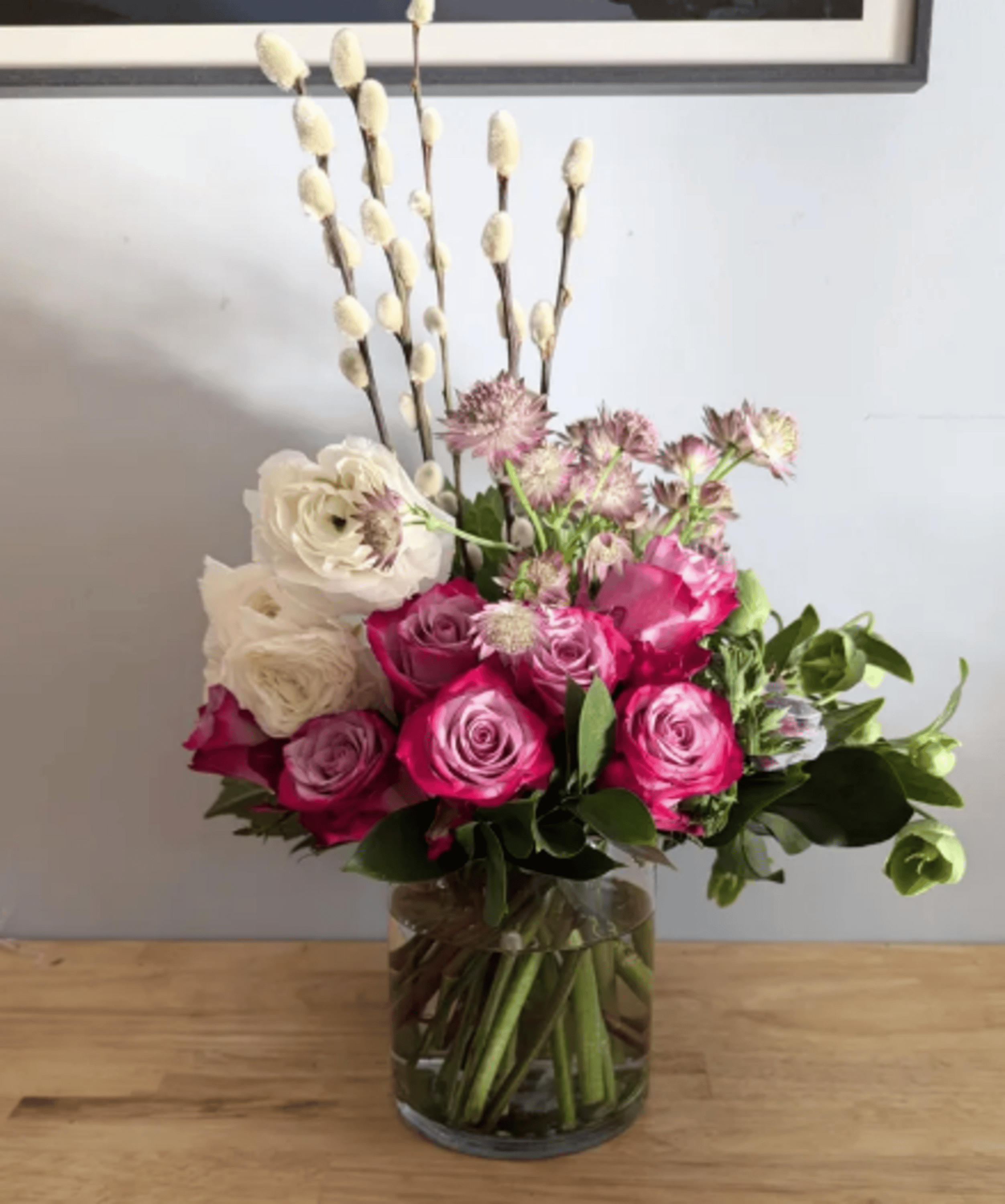 A beautifull arrangement that will include ranunculus, roses, green hydrangea and other seasonal flowers in the same tone and color palette shown. Flowers are arranged in a 5" wide x 6" tall clear glass vase. All flowers are based on availability and we always use the most fresh blooms that we have on hand.