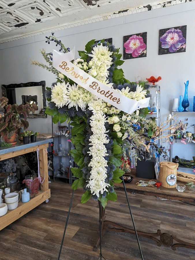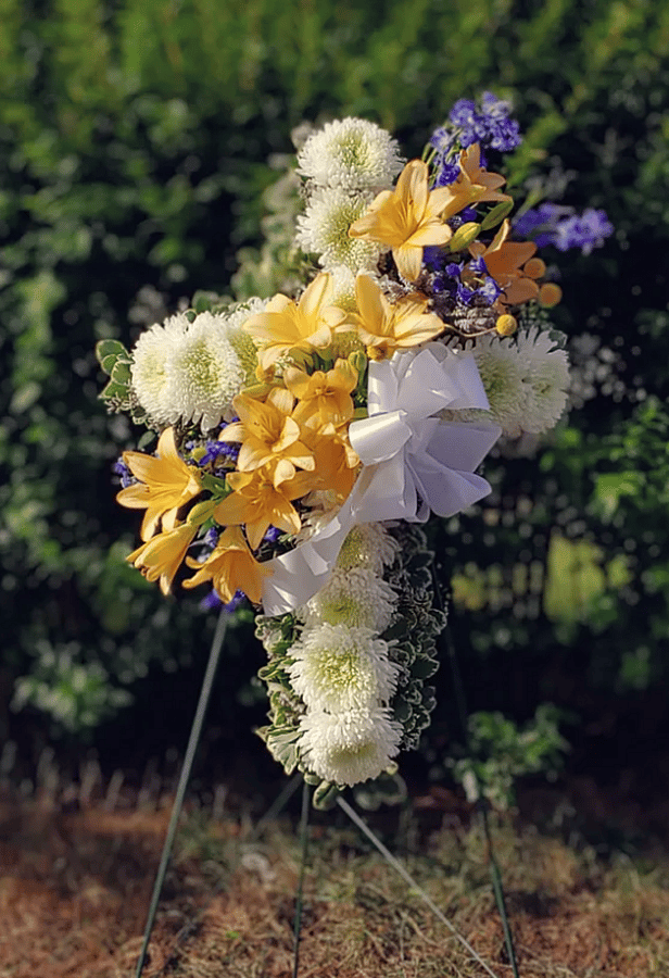 A beautiful cross adorned with football mums and a spray of contrasting flowers. Will be delivered with a metal easel. Card message or personalized ribbon (+$15): Please specify ribbon wording.