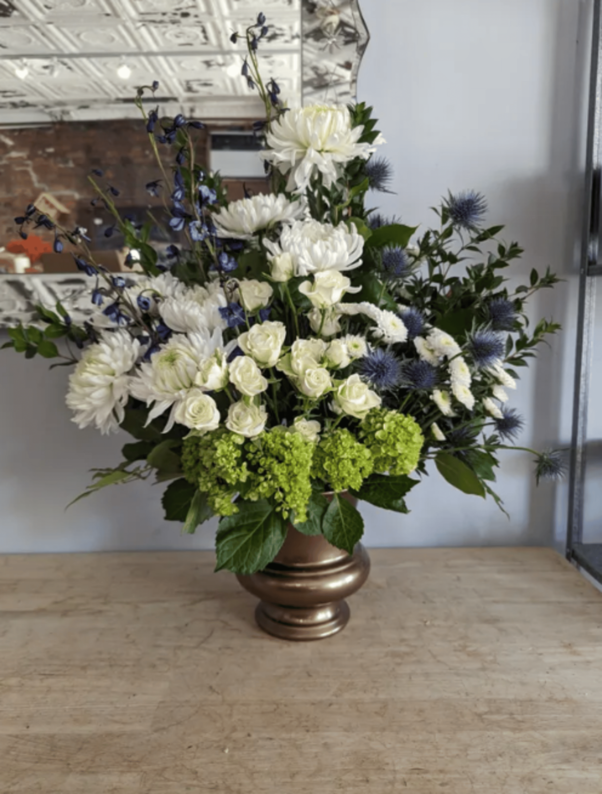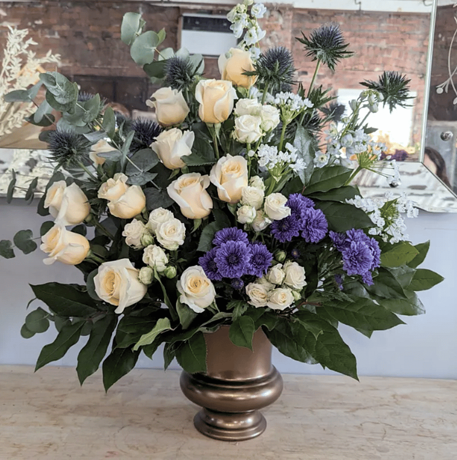 Urn arrangement of seasonal flowers. Please indicate color preference when ordering. Card Enclosure- Please provide your message in the delivery notes.