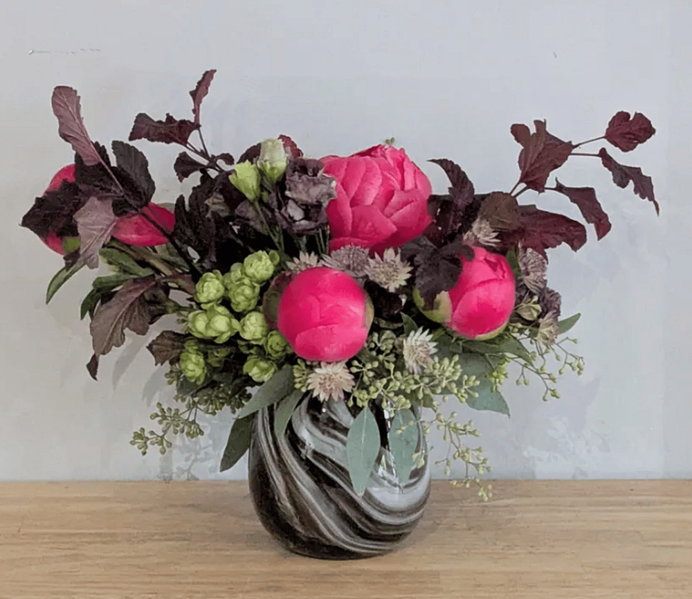 A beautiful, abundant arrangement in a unique, one-of-a-kind, handblown glass vase created by Leah Baron, RISD photography and glassblowing student. The value of the vase is $100 and the value of the flowers is $100. Vase and flower choices will vary based on availability.