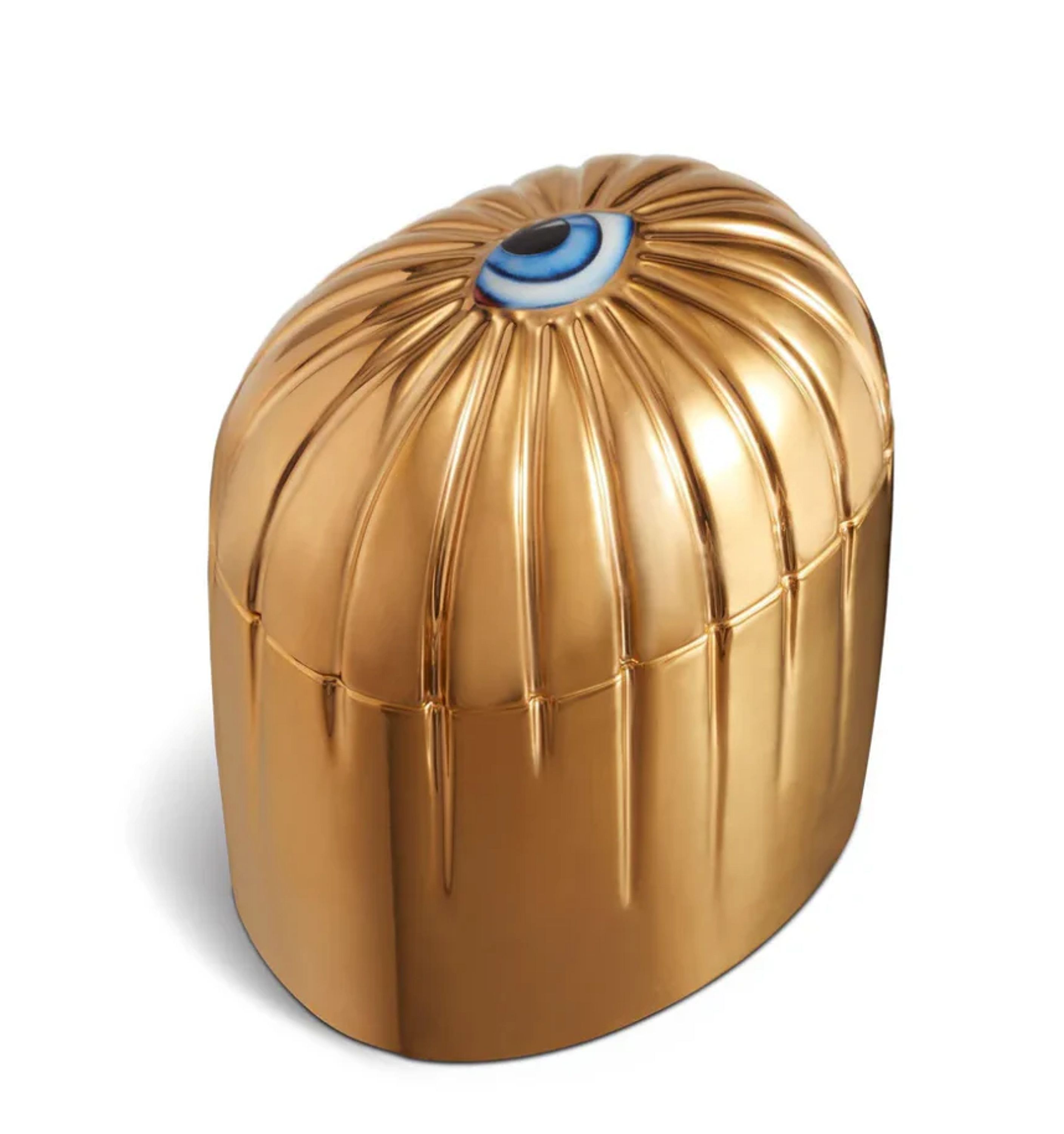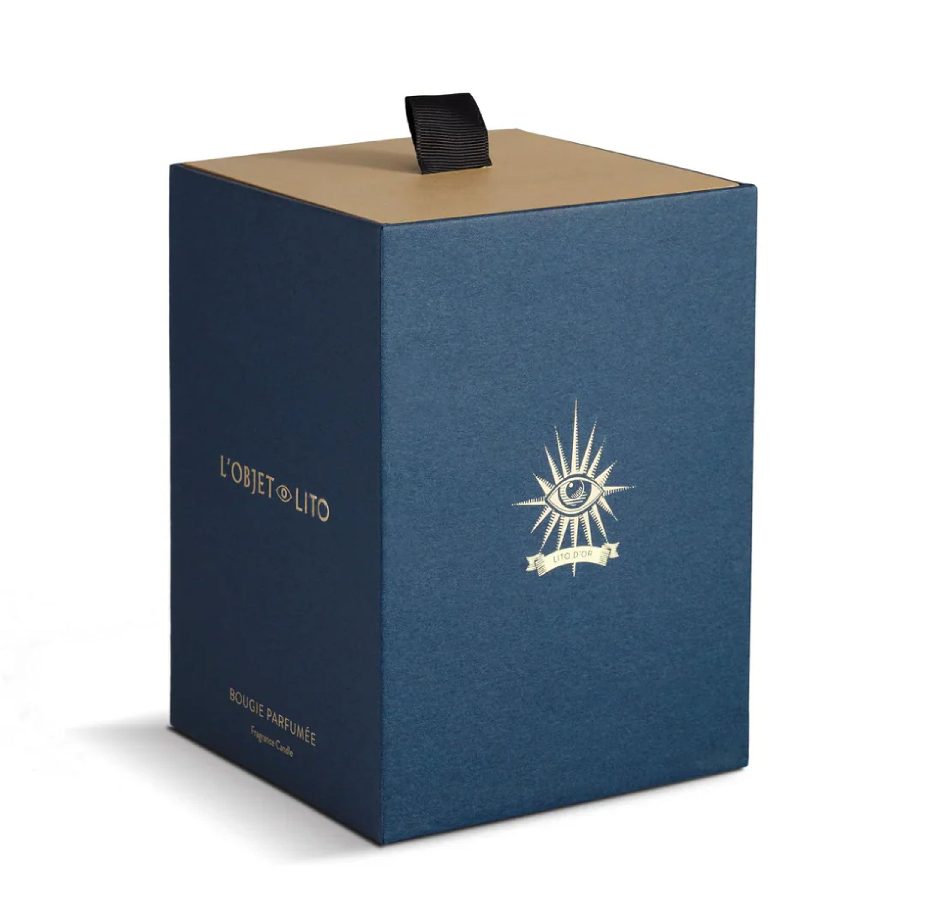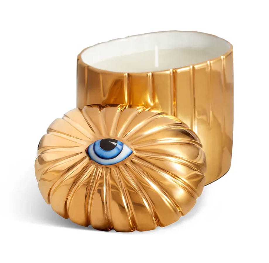 The Or Lito Candle candle is a whimsical and surreal decorative porcelain candle with a bold eye, symbolizing protection and awareness. The candle is hand-painted in 24-karat gold plating, inlaid with resin details, and filled with paraffin wax in an alluring vetiver, citrus, and moss fragrance developed with perfumer Yann Vasnier and crafted and assembled from our Atelier in Portugal.