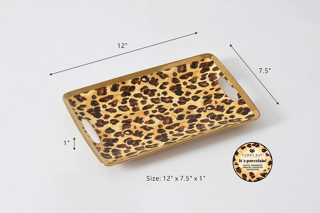 Add a touch of wild elegance to your home with this bold and exotic small tray. Suits all types of tables and is plenty chic for elegant occasions! Perfect for serving side dishes, appetizers, and desserts. Stunning high-fired porcelain with an eye-catching animal print design and gold-toned rim.
