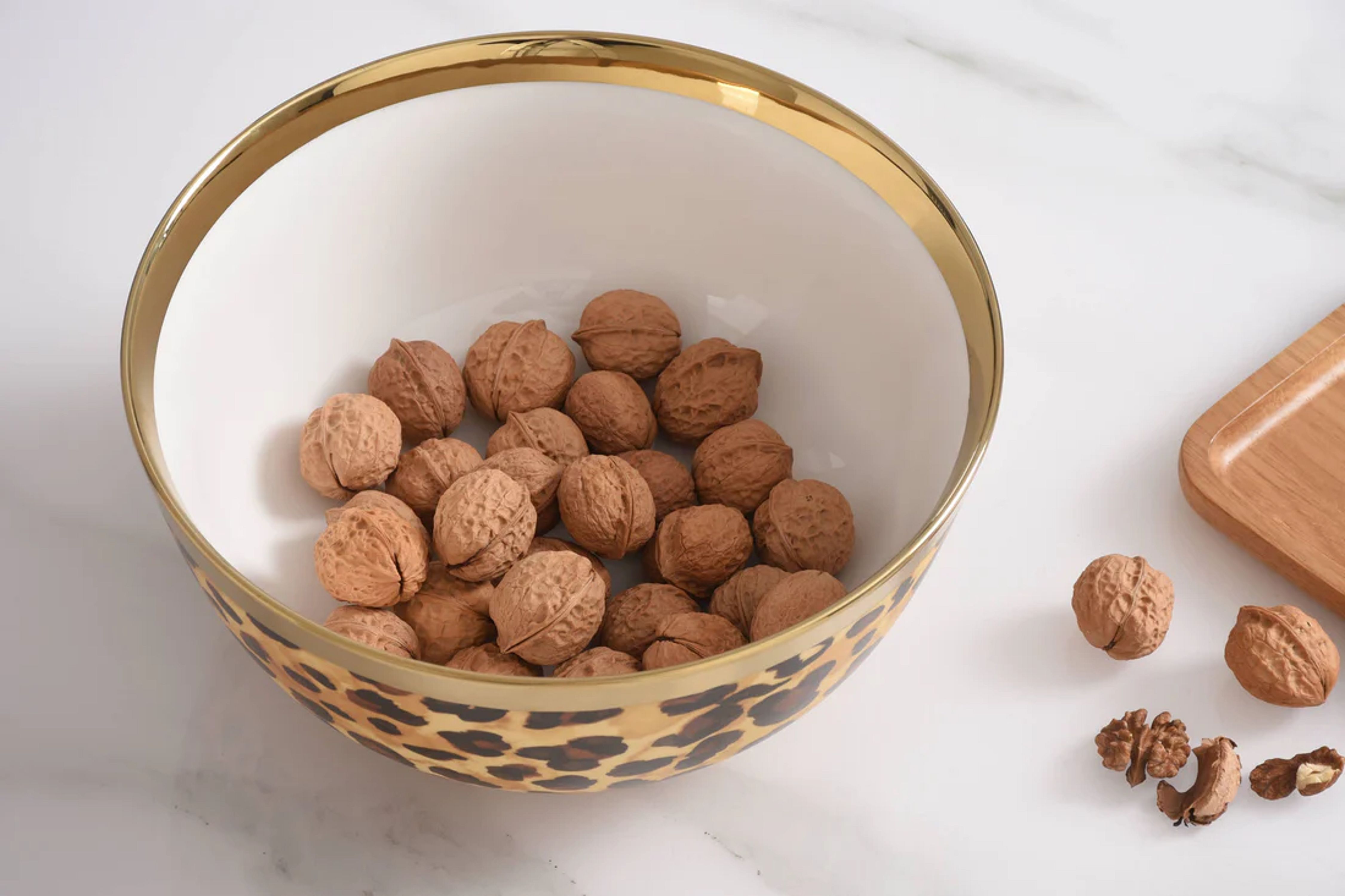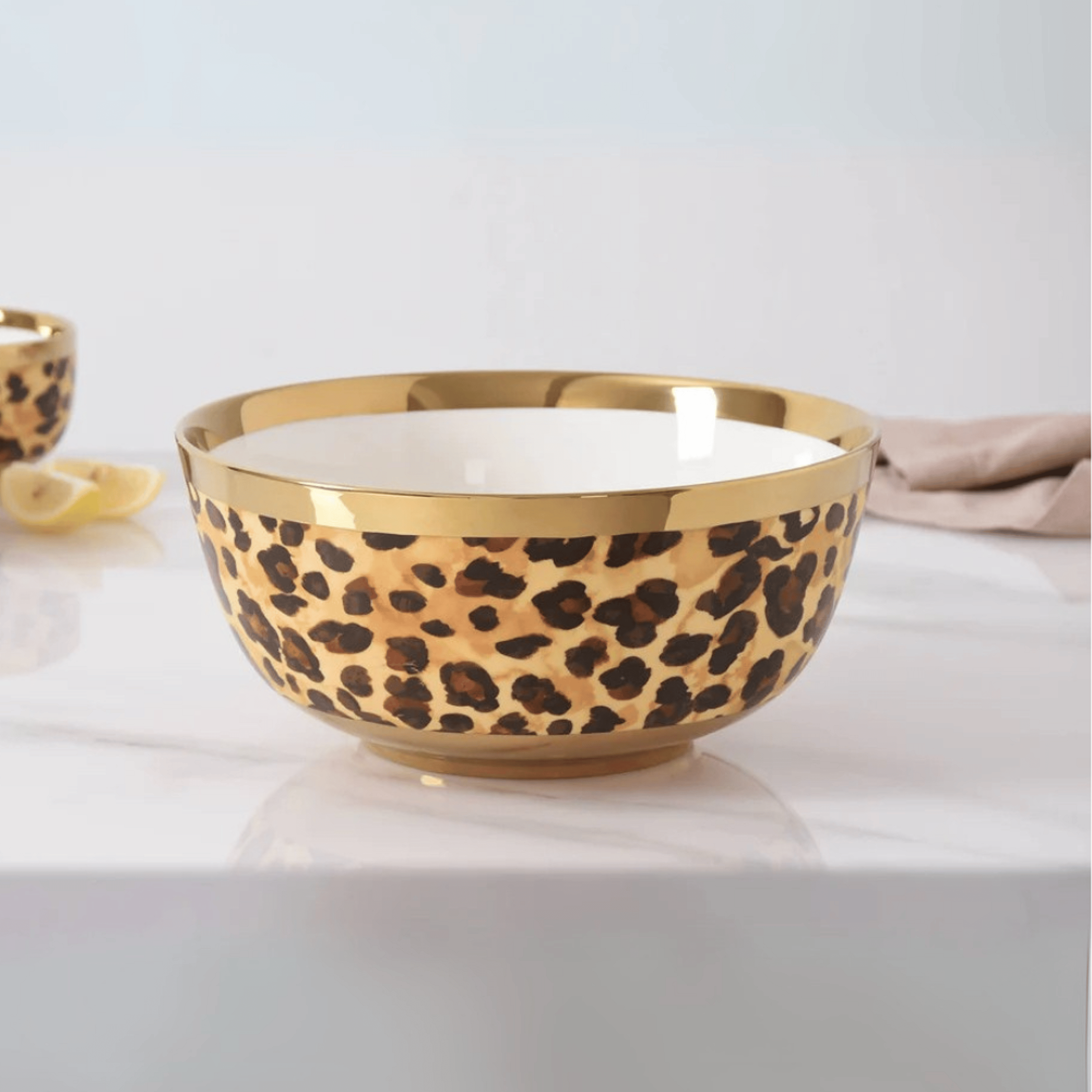 Add a touch of wild elegance to your home with this bold and exotic Large Bowl with an animal print. Generously sized bowl for serving salads or side dishes like mashed potatoes, roasted vegetables, or rice! Stunning high-fired porcelain with an eye-catching animal print design and gold-toned rim.