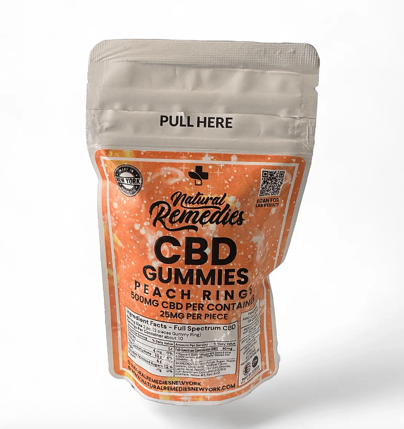 Natural Remedies 500mg CBD Peach Rings -20 Gummies Per BaG - 25mg Per Piece