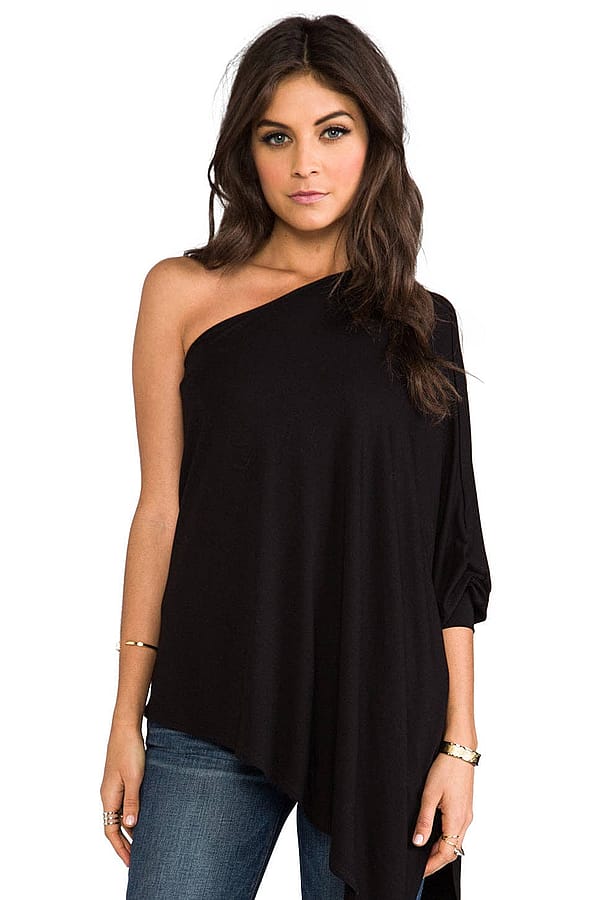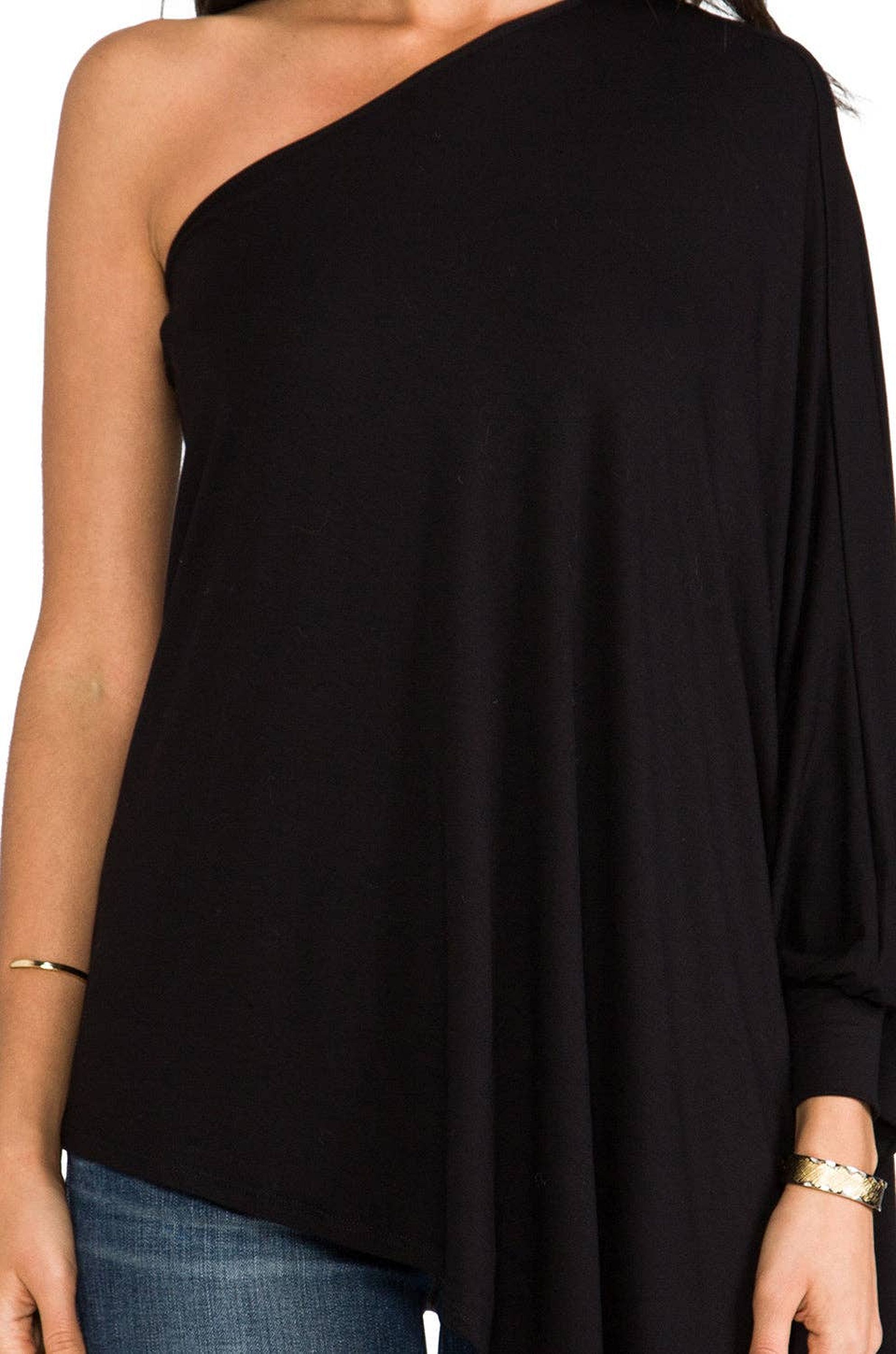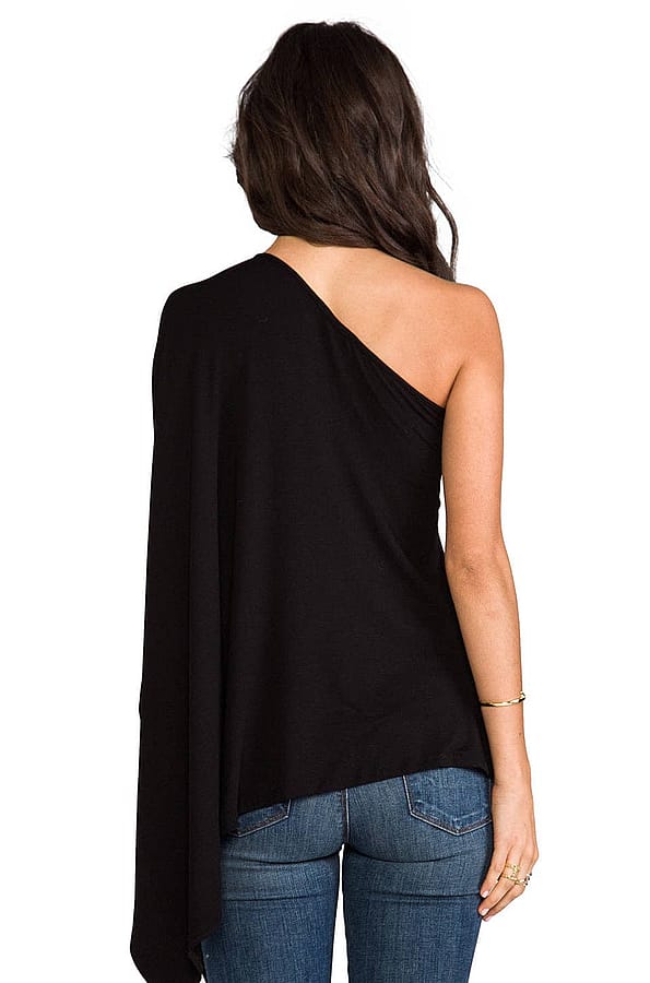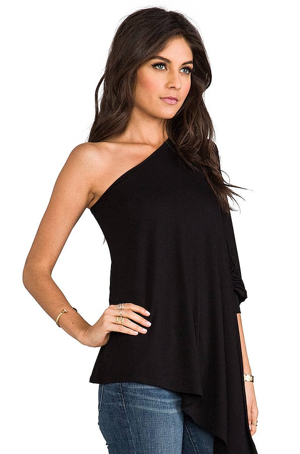 95% viscose , 5% spandex Dry clean only Elasticized neckline Draped side detail Asymmetric hem
