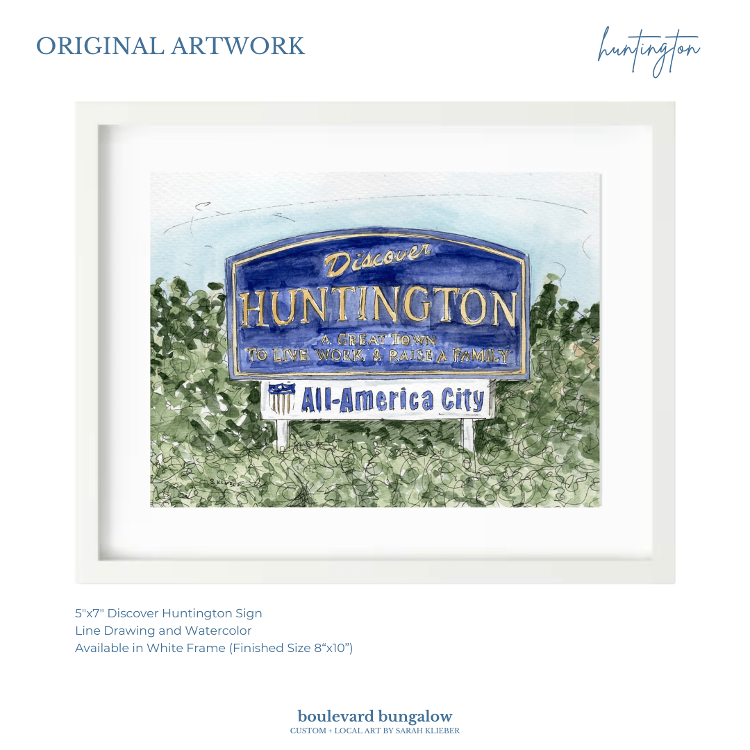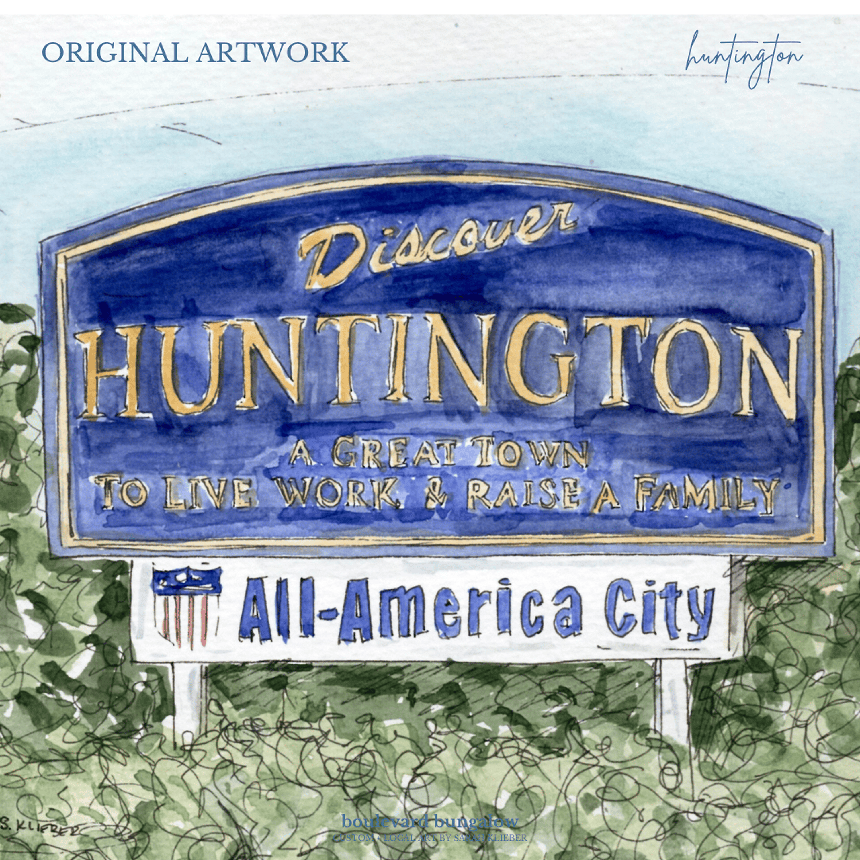 This artwork captures the charm of the iconic Huntington Welcome Sign, a symbol of community and local pride. The piece highlights the charm and character of this beloved local landmark, capturing both its welcoming spirit and artistic beauty.