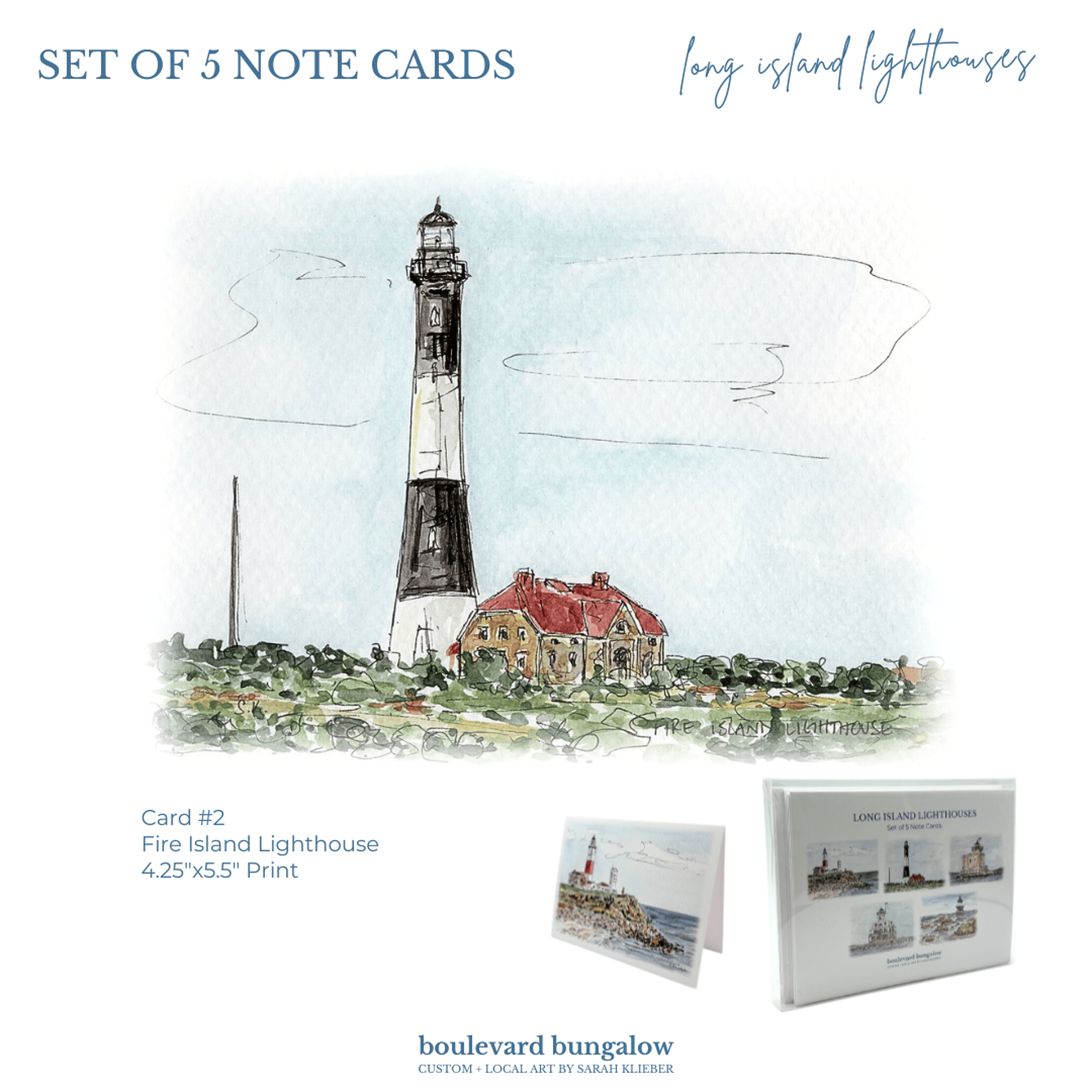 Send a touch of coastal charm with this set of 5 lighthouse note cards. Each features a delicate line drawing and watercolor of iconic Long Island Lighthouses, capturing their timeless beauty. Blank inside for your personal message, perfect for notes, gifts, or keepsakes.