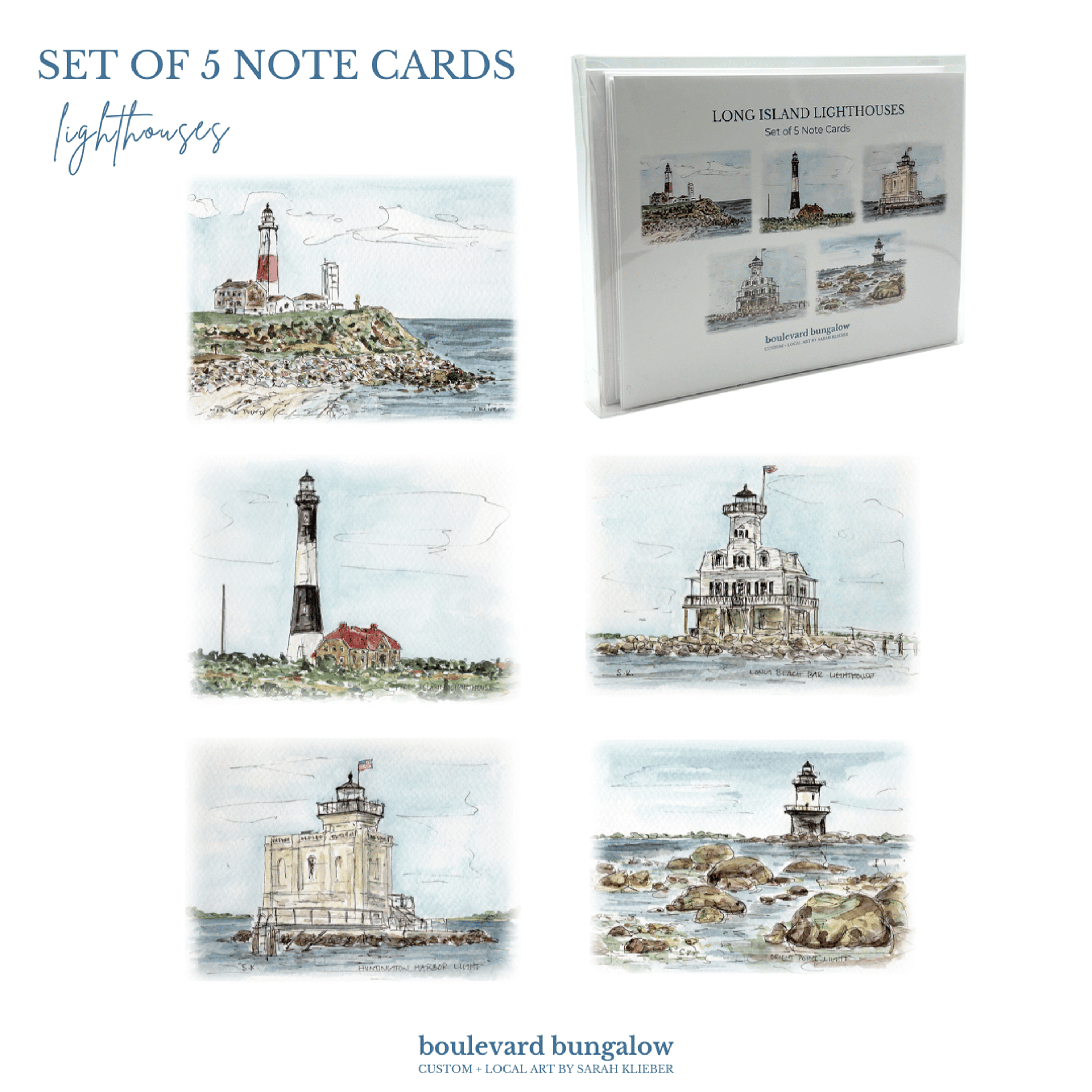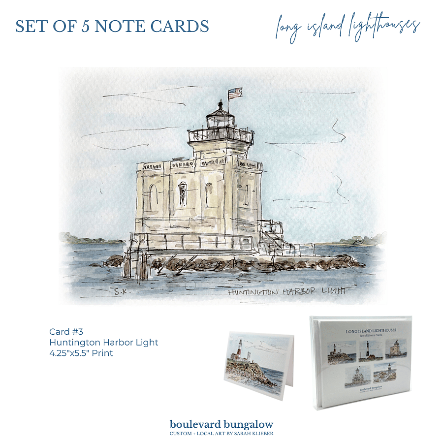 Send a touch of coastal charm with this set of 5 lighthouse note cards. Each features a delicate line drawing and watercolor of iconic Long Island Lighthouses, capturing their timeless beauty. Blank inside for your personal message, perfect for notes, gifts, or keepsakes.