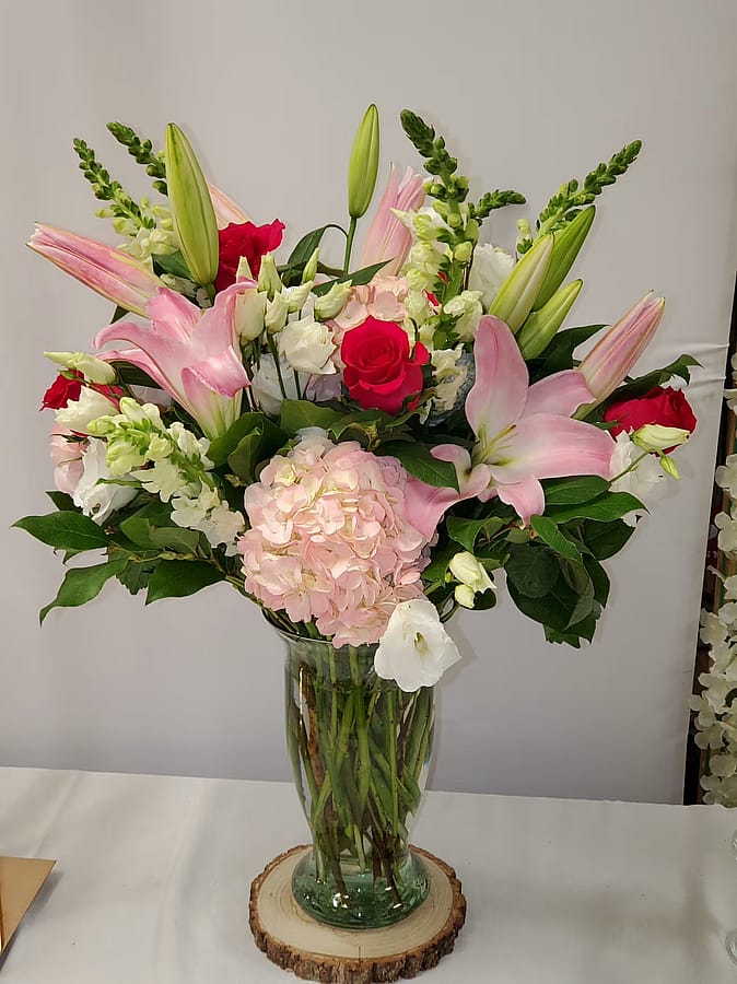 Mix arrangement with roses, hydrangea, lilys, snapdragon and stock.