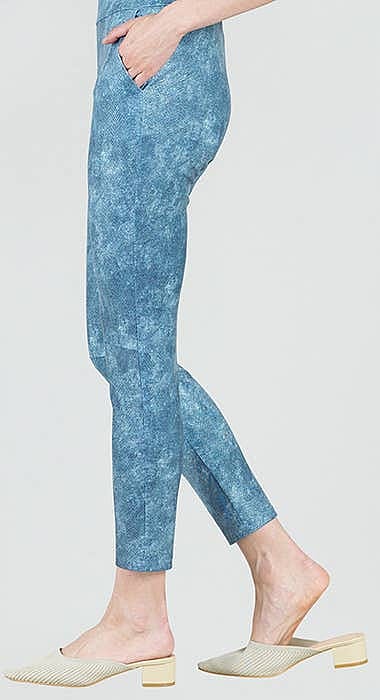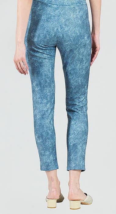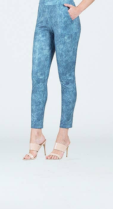 A style that will flatter any figure & the best part is while they have a slimming silhouette they are not skin tight so won't reveal any body flaws. Our Denim print displays an acid wash of denim blue, navy, and subtle hints of white with a scale-like texture that creates a realistic jean effect. Textured Liquid Leather Knit This vegan-friendly fabric offers superior comfort and style. Crafted from our signature flexible polyester blend and coated in a faux leather-like scaled-like textured finish, it's cool to the touch, quick-drying, and easy to maintain. Enjoy the look and feel of leather without the guilt. 1" Elastic Waistband Ultra Lightweight Soft Knit Fabric - Faux Leather Scale-Like Textured Matte Finish Vegan Friendly!