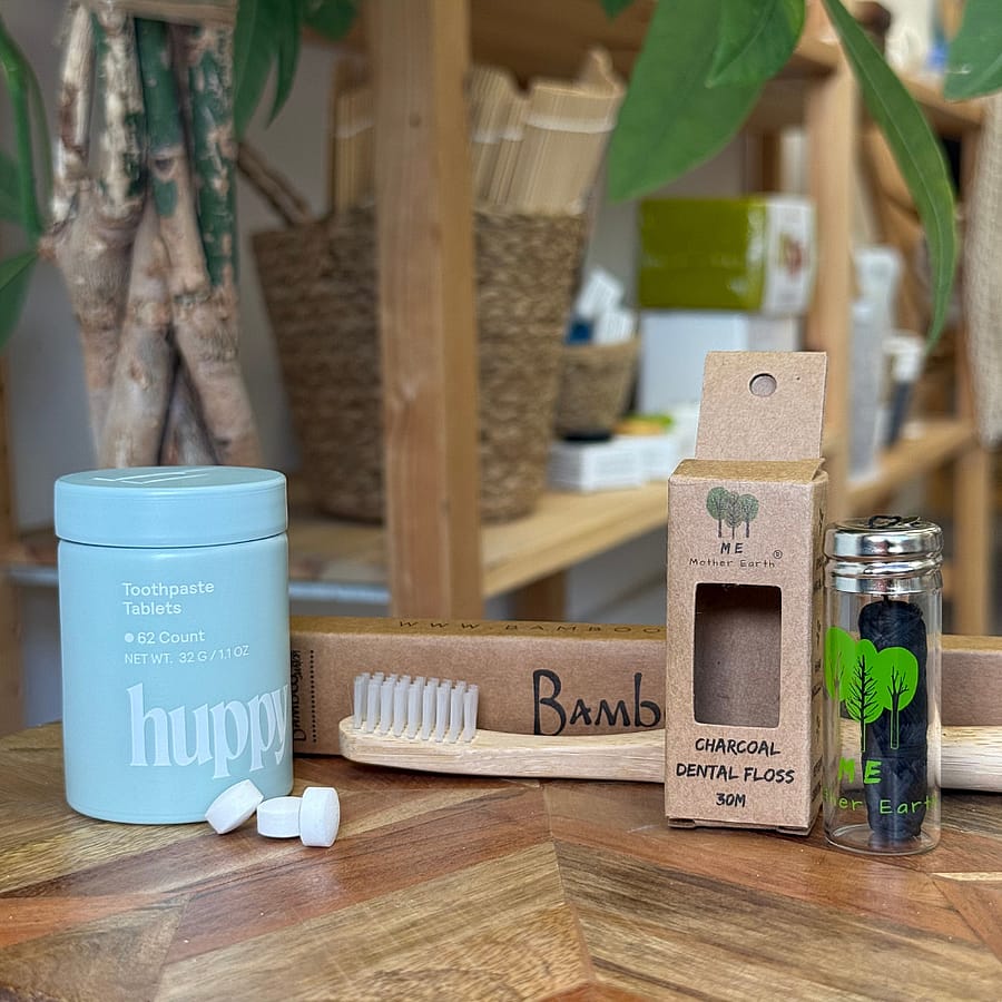 Includes: - Refillable canister of Toothpaste Tablets by Huppy - Bamboo Switch Toothbrush castor bean bristles which allows for them the toothbrush to be fully compostable - Refillable Charcoal Dental Floss selfcare