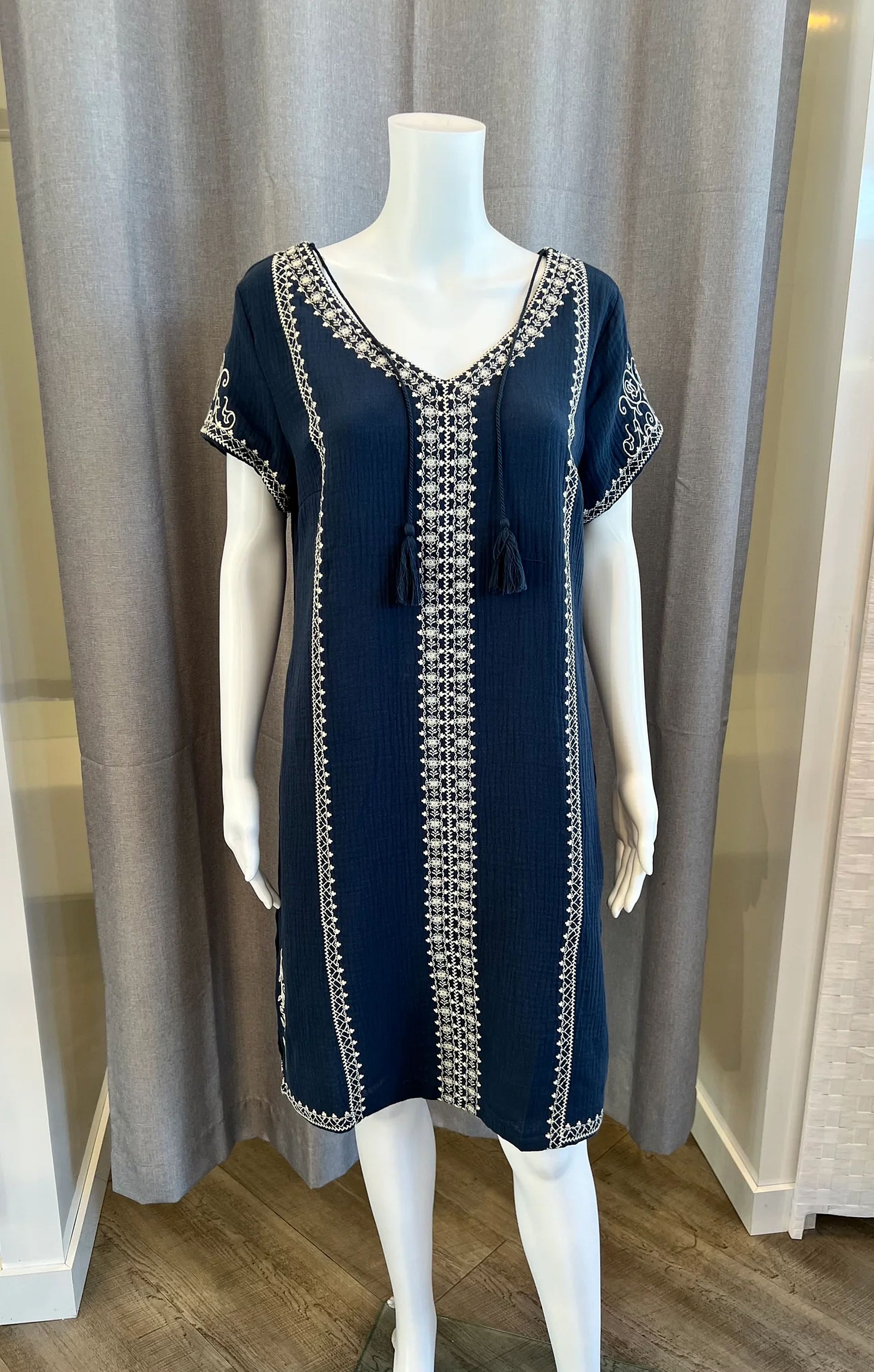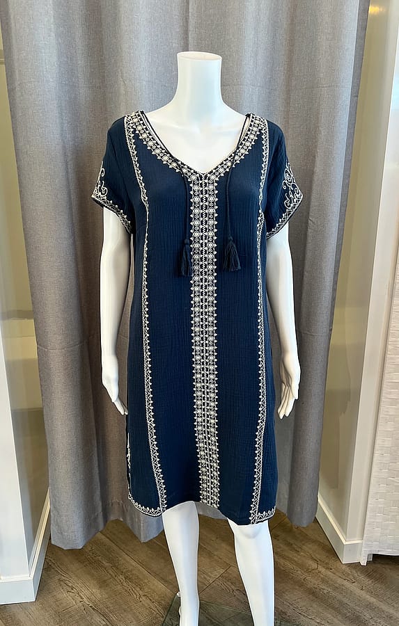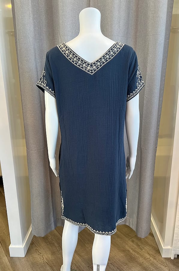 Blue Embroidered Dress- 100% Cotton, short sleeve, machine washable, cream embroidered detailing.