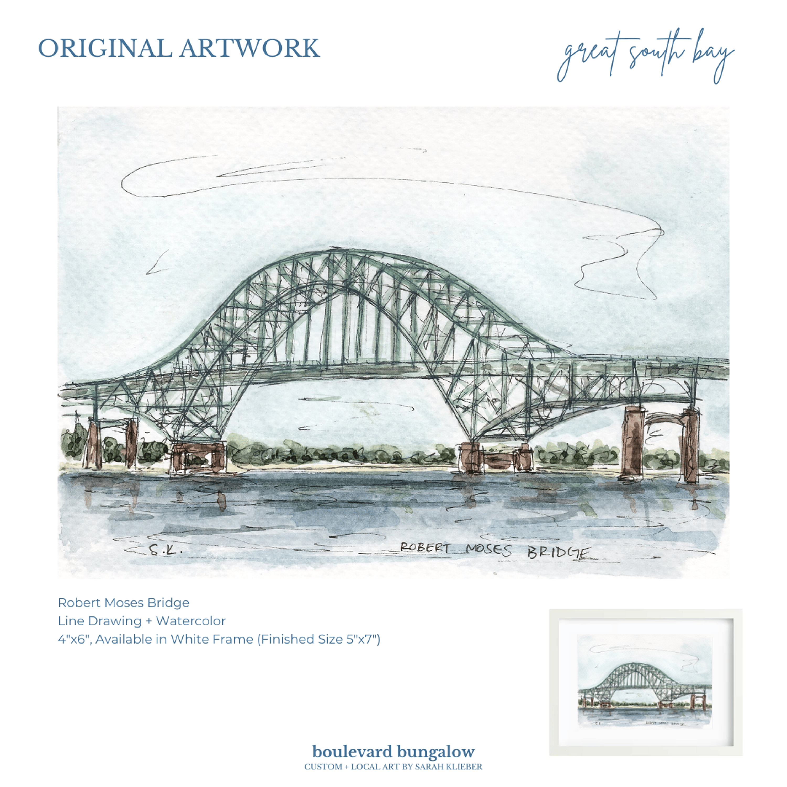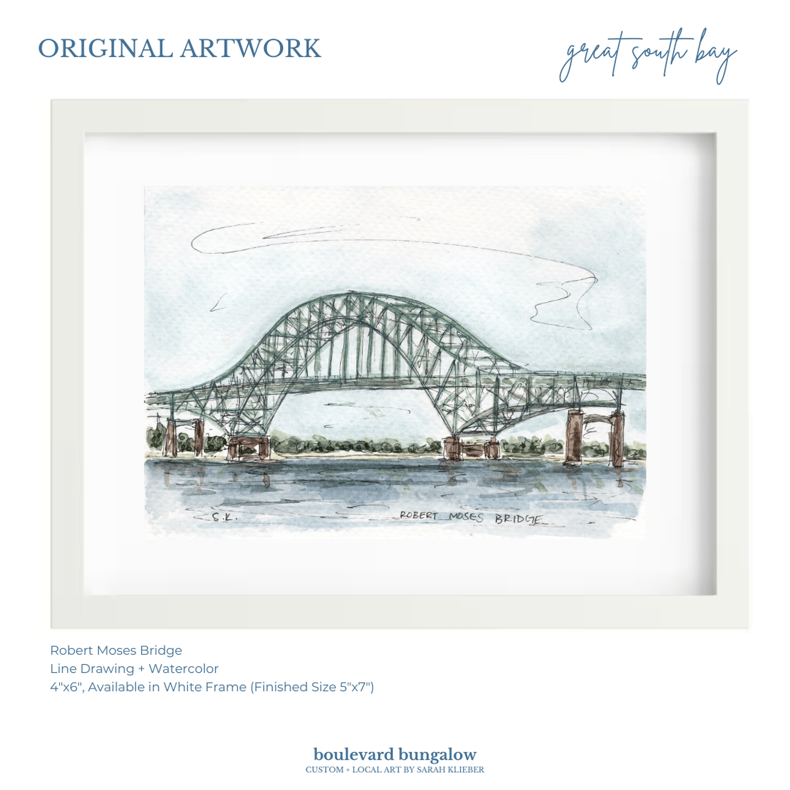 Line drawing and watercolor artwork of the Robert Moses Bridge, part of the Great South Bay Collection, featuring delicate detail and soft coastal color.