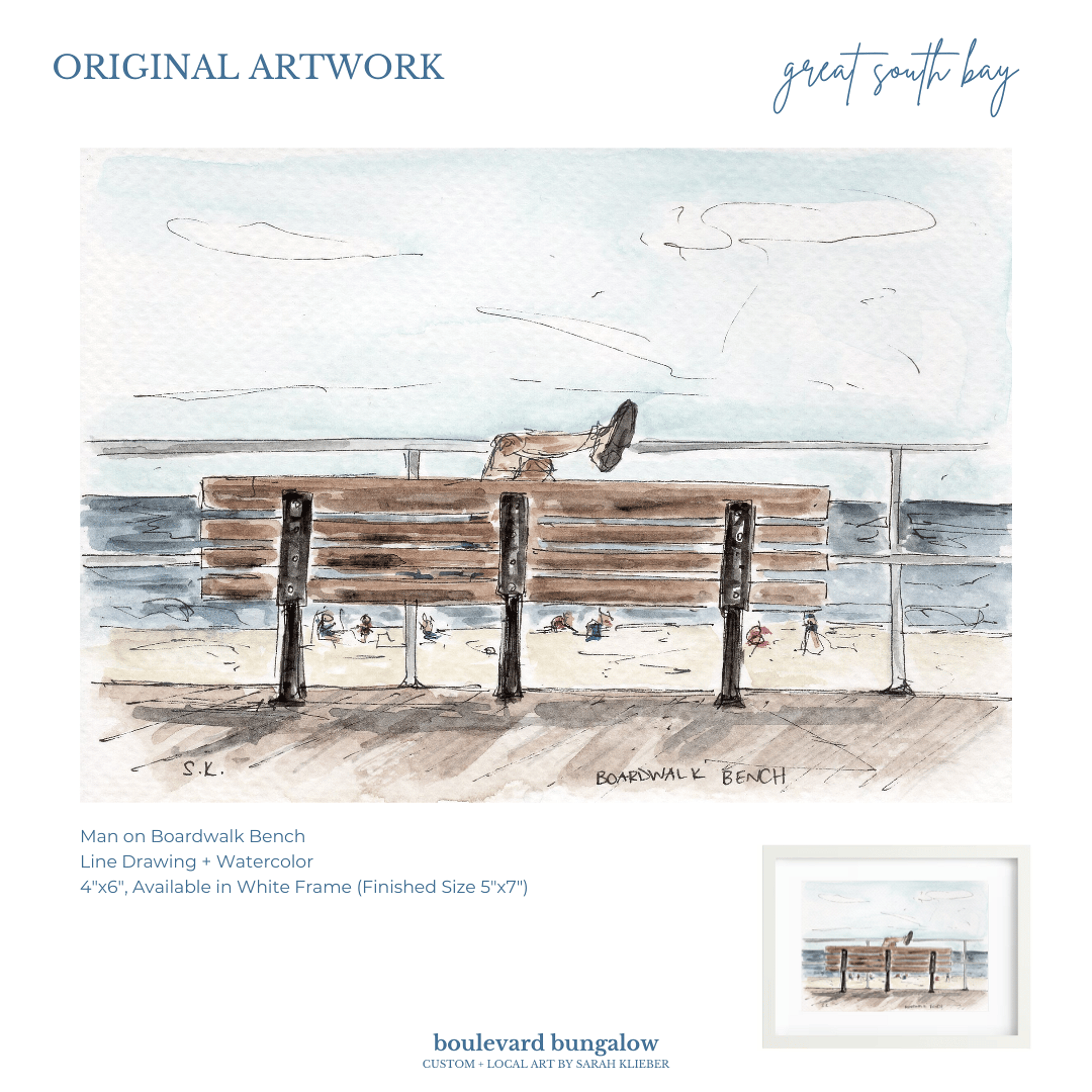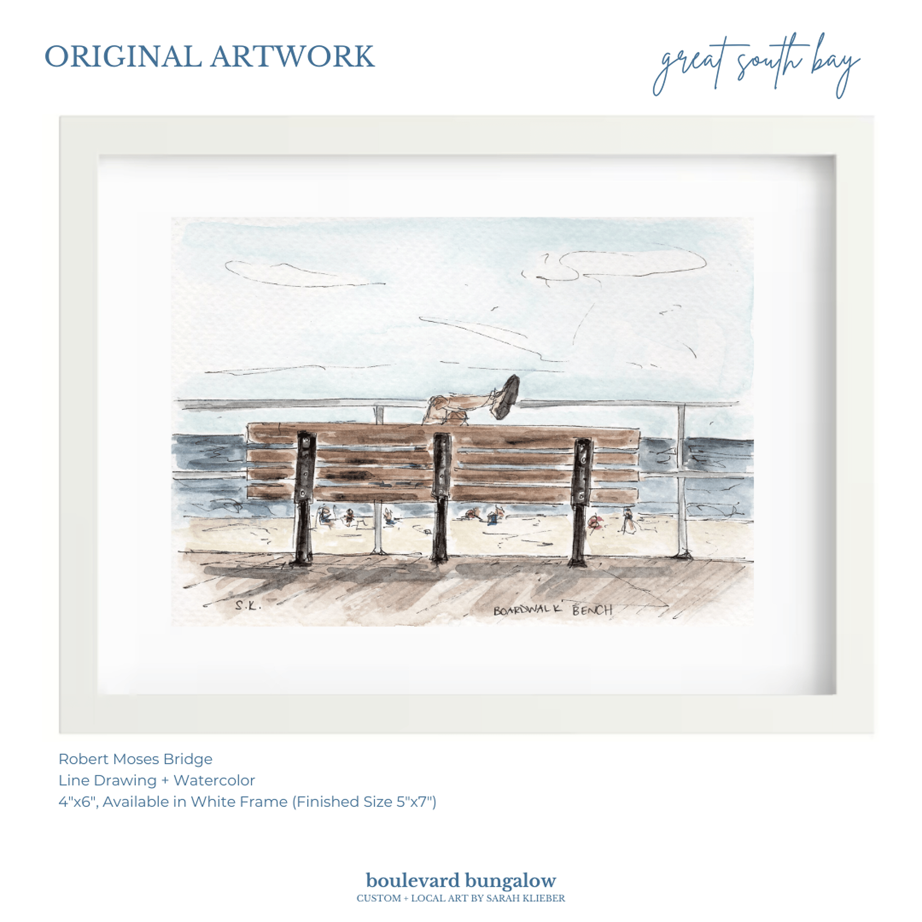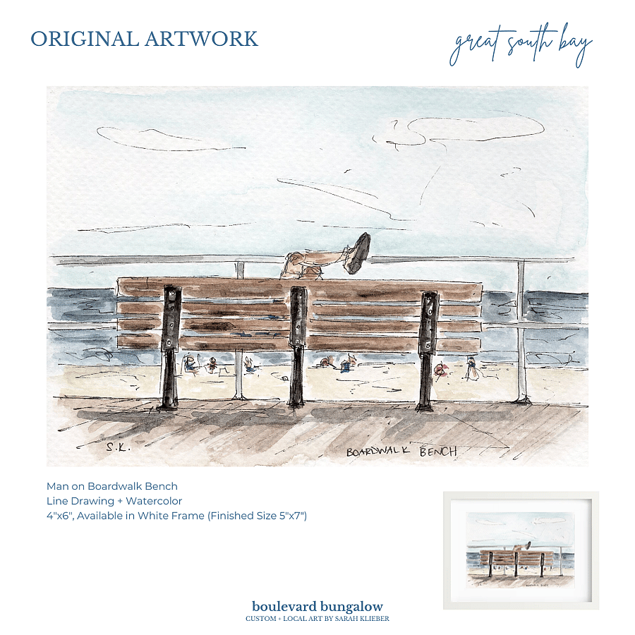 Line drawing and watercolor artwork of the Long Beach boardwalk bench, part of the Great South Bay Collection, blending clean detail with soft seaside hues.