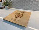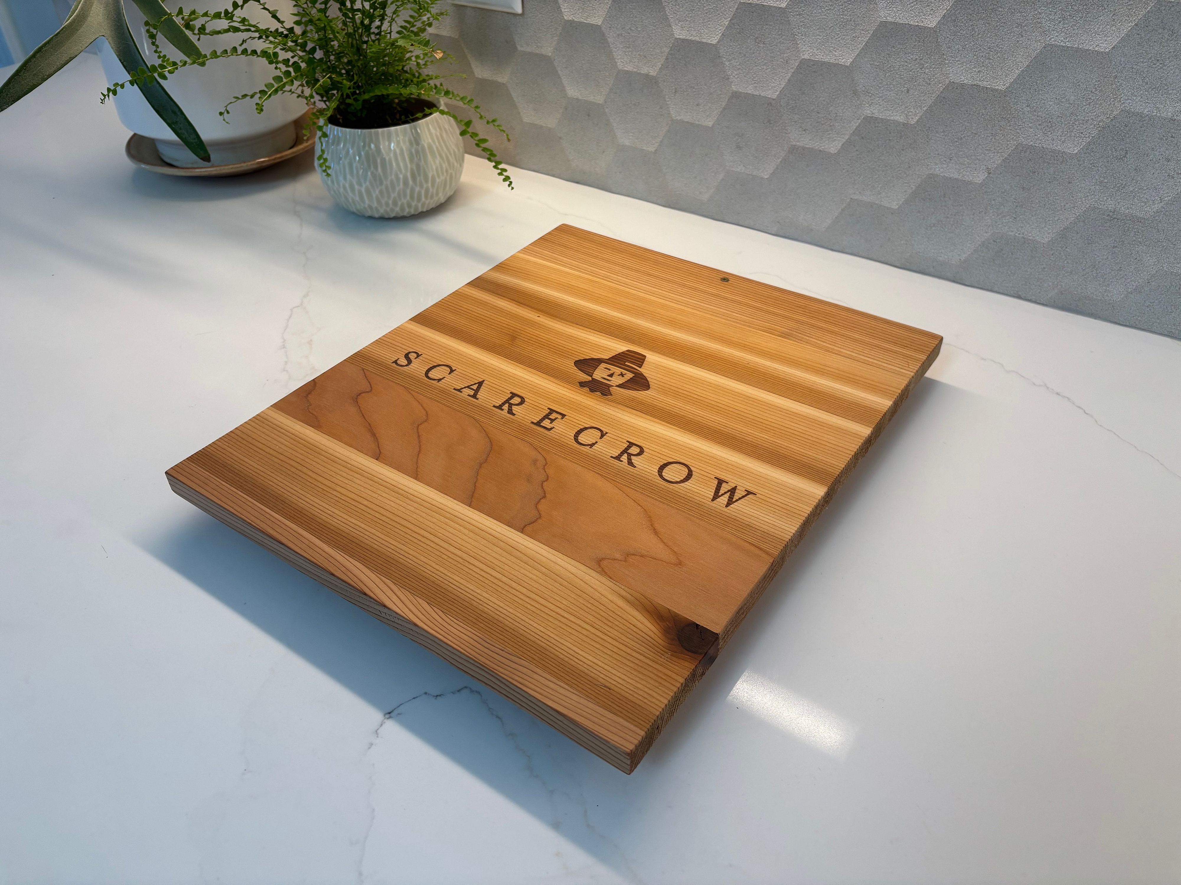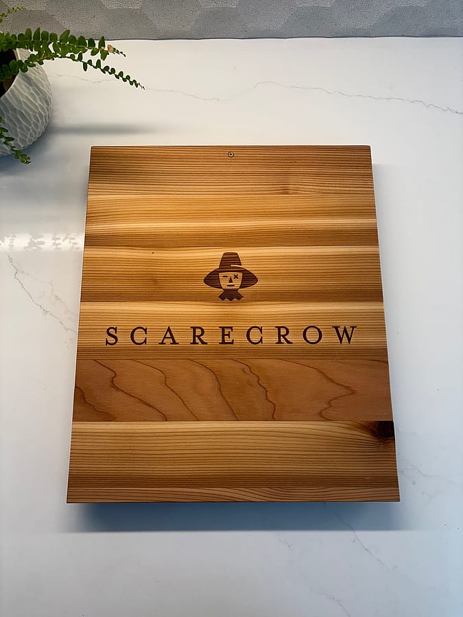 Charchuterie board made from a Scarecrow wooden wine box. Scarecrow Wines producer named the brand after the owners grandfather, Joseph Judson Cohn, an MGM executive producer of The Wizard of Oz. This Cedar board measures 11.25" w x 13.25"d x 1"h and is sealed with food safe oil. Knife work is not recommended due to the soft nature of the wood.
