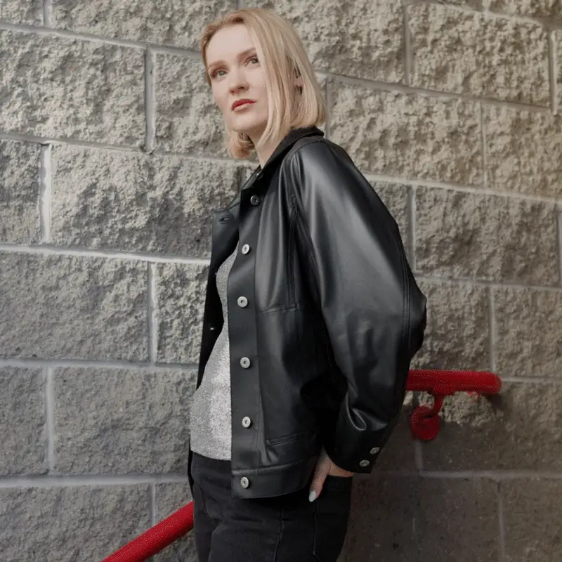 Liquid Leather Sheen-Knit This vegan-friendly fabric offers superior comfort and style. Crafted from our signature flexible polyester blend and coated in a faux leather-like sheen finish, it's cool to the touch, quick-drying, and easy to maintain. Button Closure Satin-Like Lining Travel Friendly Ultra Lightweight Soft Knit Fabric - Faux Leather Sheen Finish Vegan Friendly
