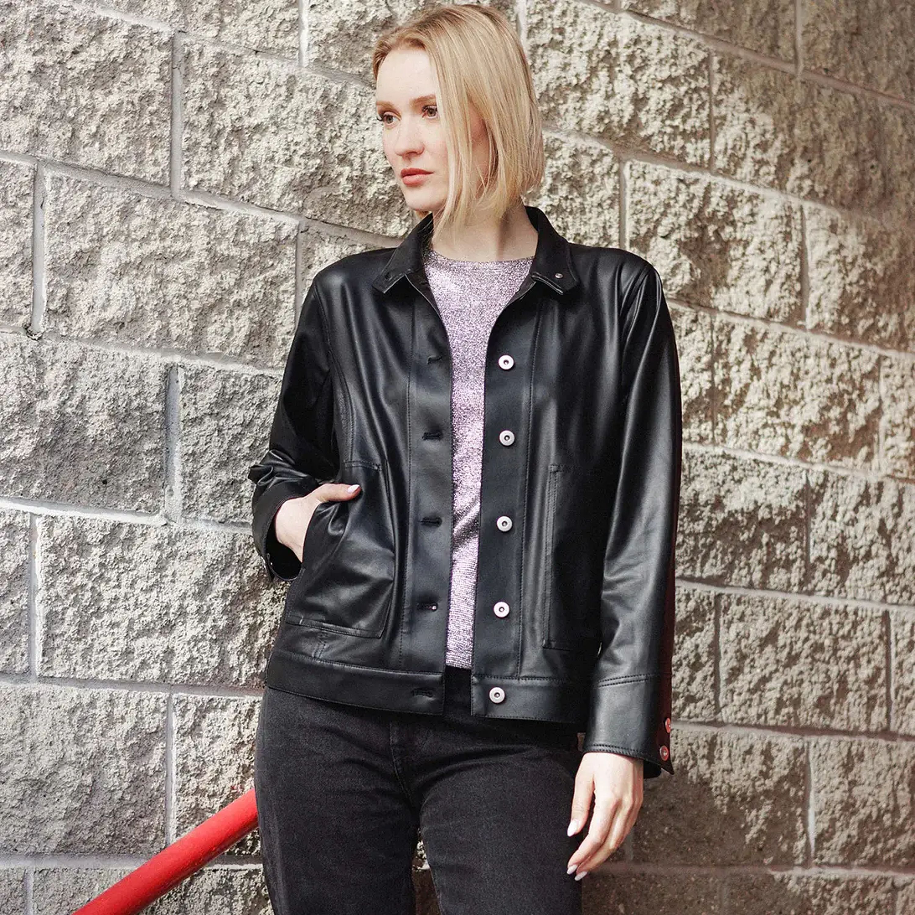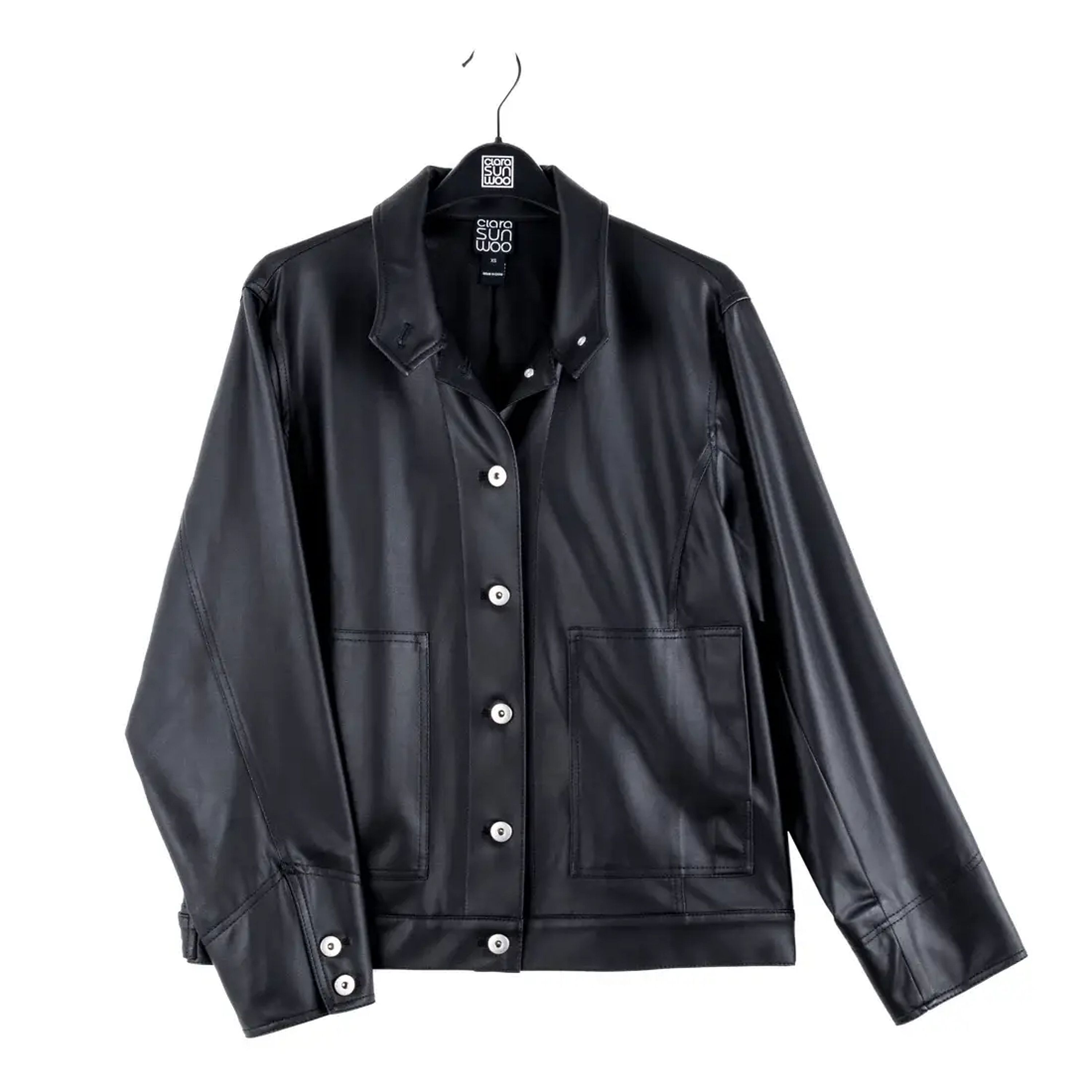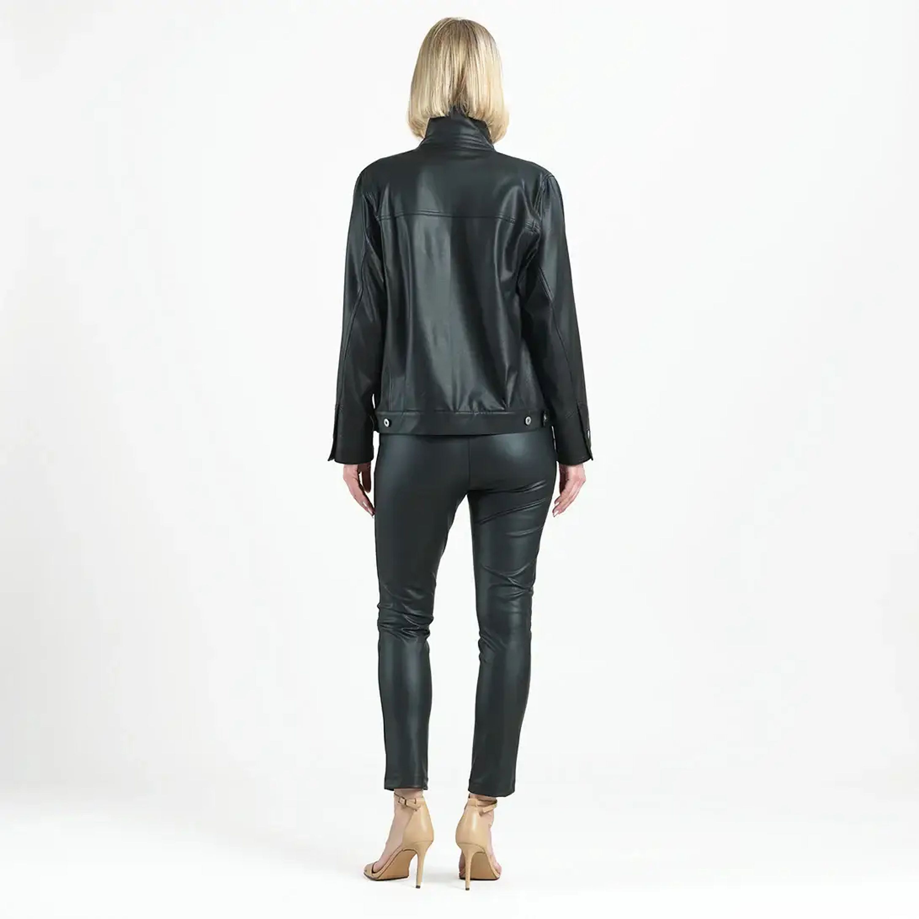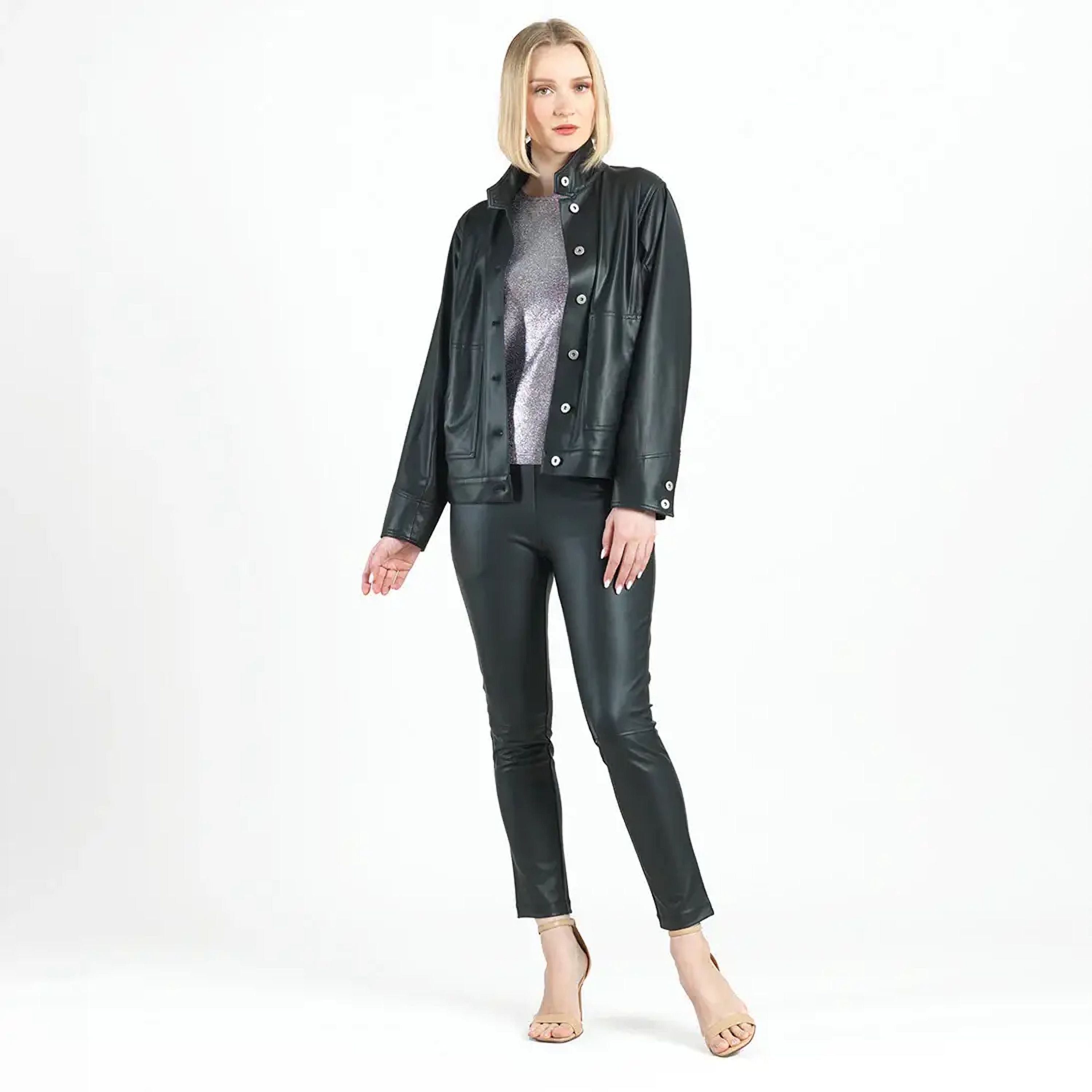 Our Liquid Leather Button Closure Pocket Jacket features a soft-matte finish with a satin-like interior lining, 6-button up closure with a fold-over throat latch collar, 2-button cuff closure, rectangular panel side pockets, back yoke seam with singular bottom side pleats, an adjustable button hem detail, and seamed stitching throughout the silhouette.