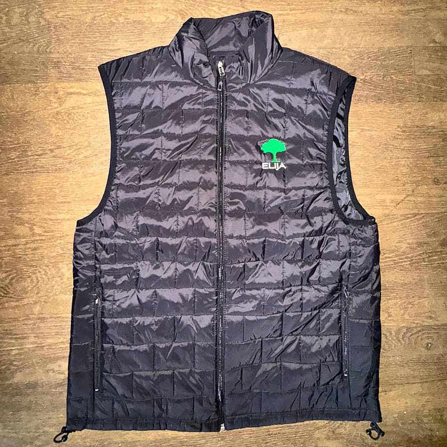 Black puffer vest with white and green ELIJA logo.