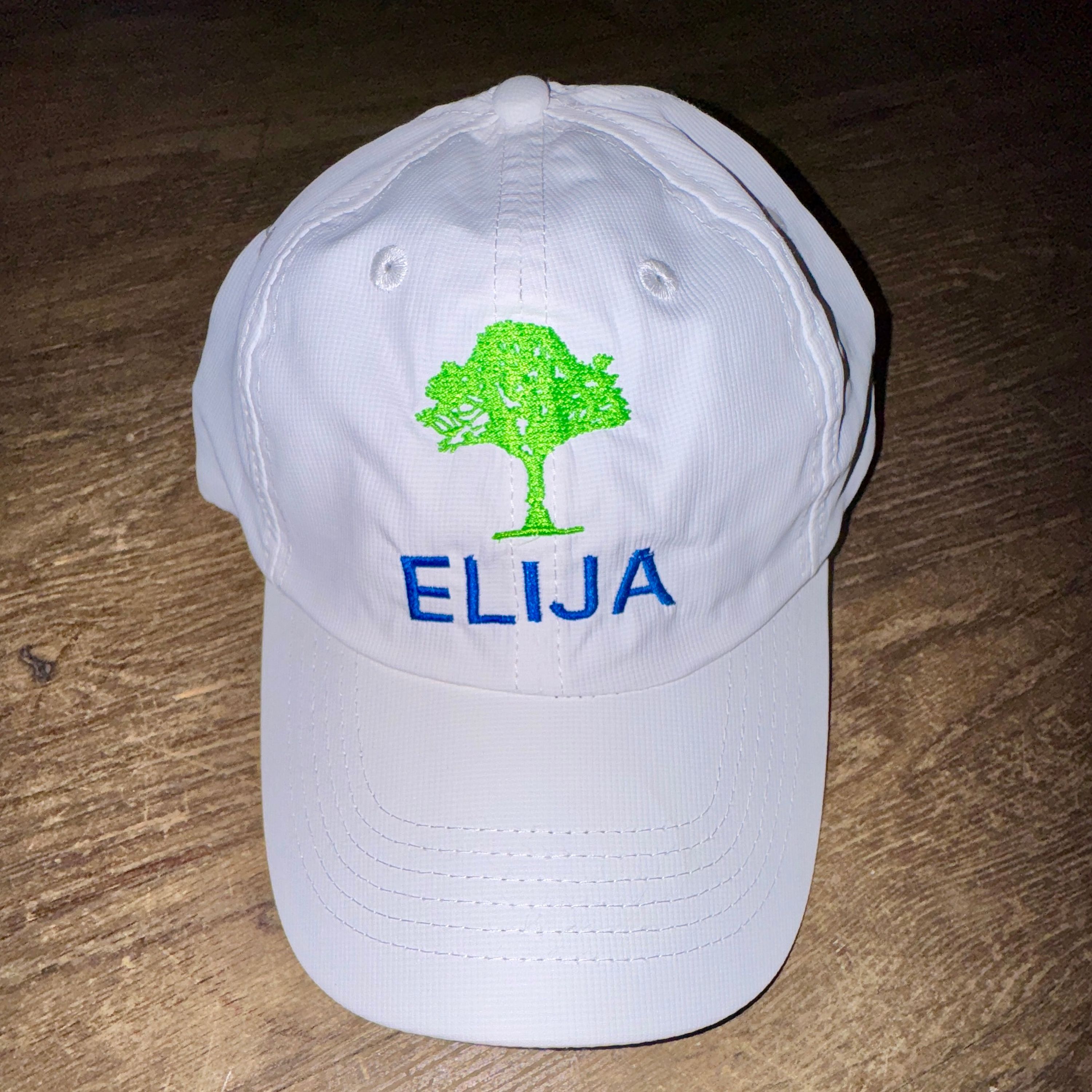White baseball cap with blue ELIJA letters and green ELIJA tree.
