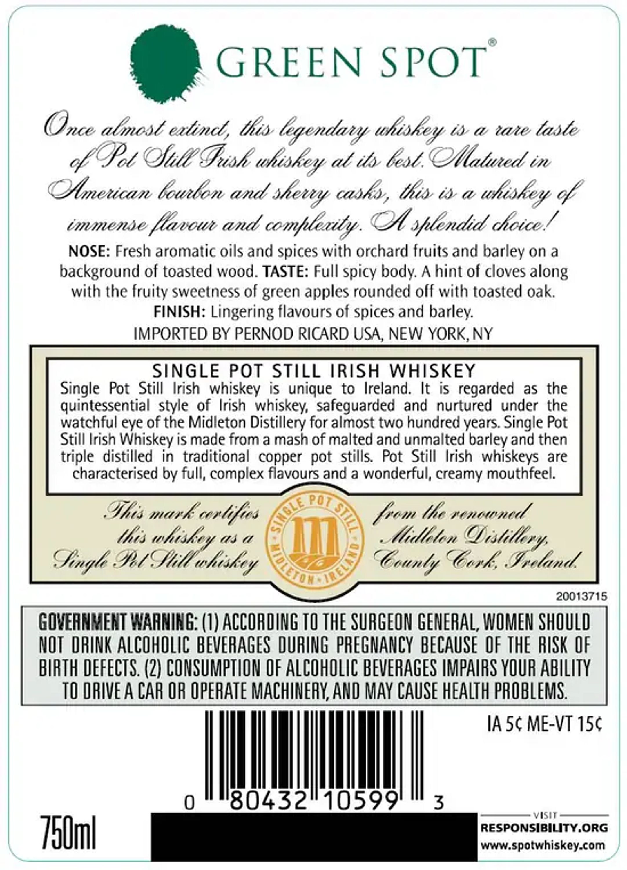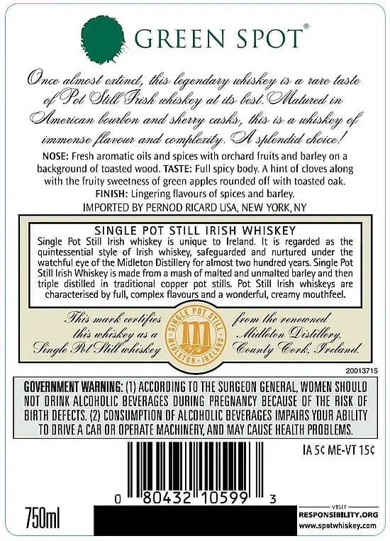 Green Spot is a non-age statement Single Pot Still Irish whiskey and is comprised of Pot Still whiskeys aged between 7 and 10 years. The whiskey has matured in both ex-bourbon and ex-sherry casks with only a small quantity bottled each year.