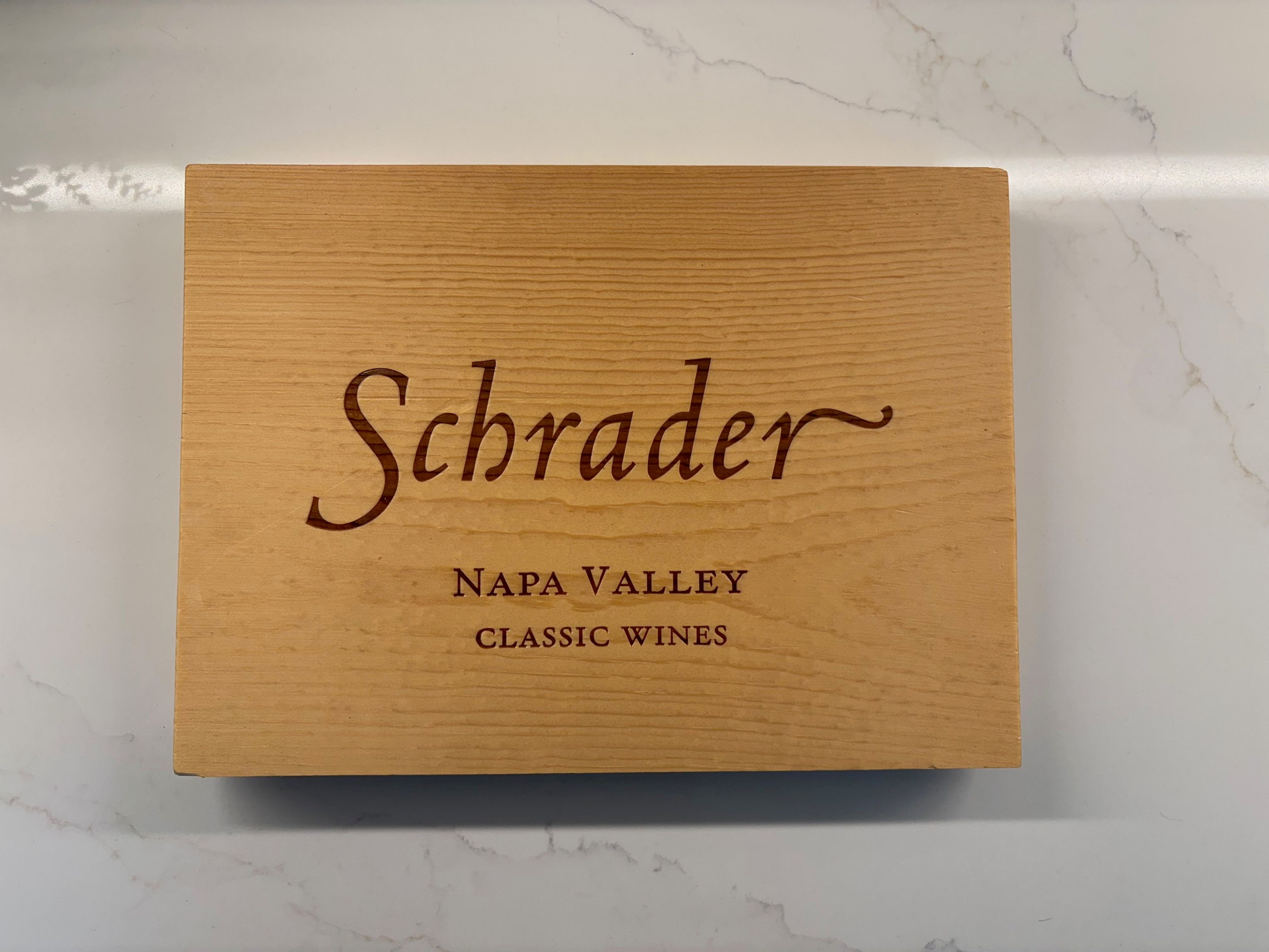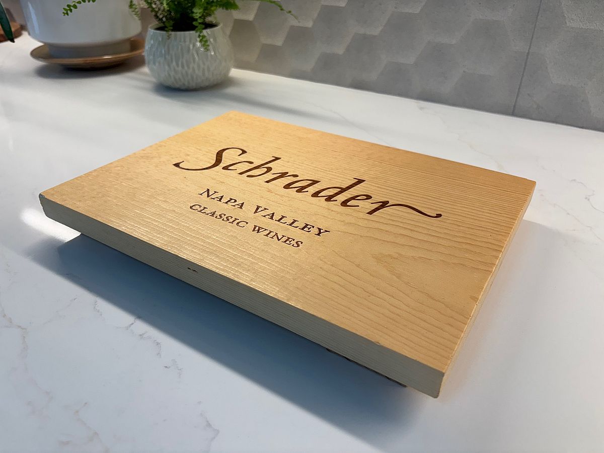 This Schrader Charcuterie board is made of Pine wood and is repurposed from a 6 pack wine box. Schrader produces some of the best Cabernet Sauvignon in Napa Valley and has received countless 100 points ratings from various wine critics. A perfect gift for any wine lover. Knife work is not recommended due to the soft nature of the wood.