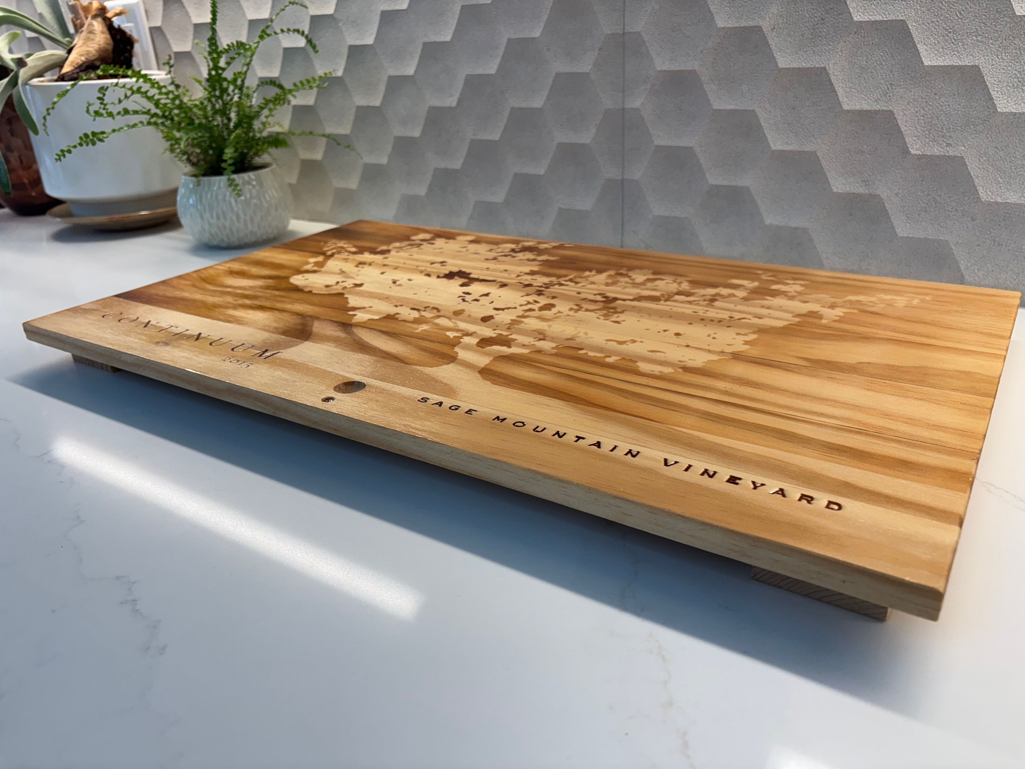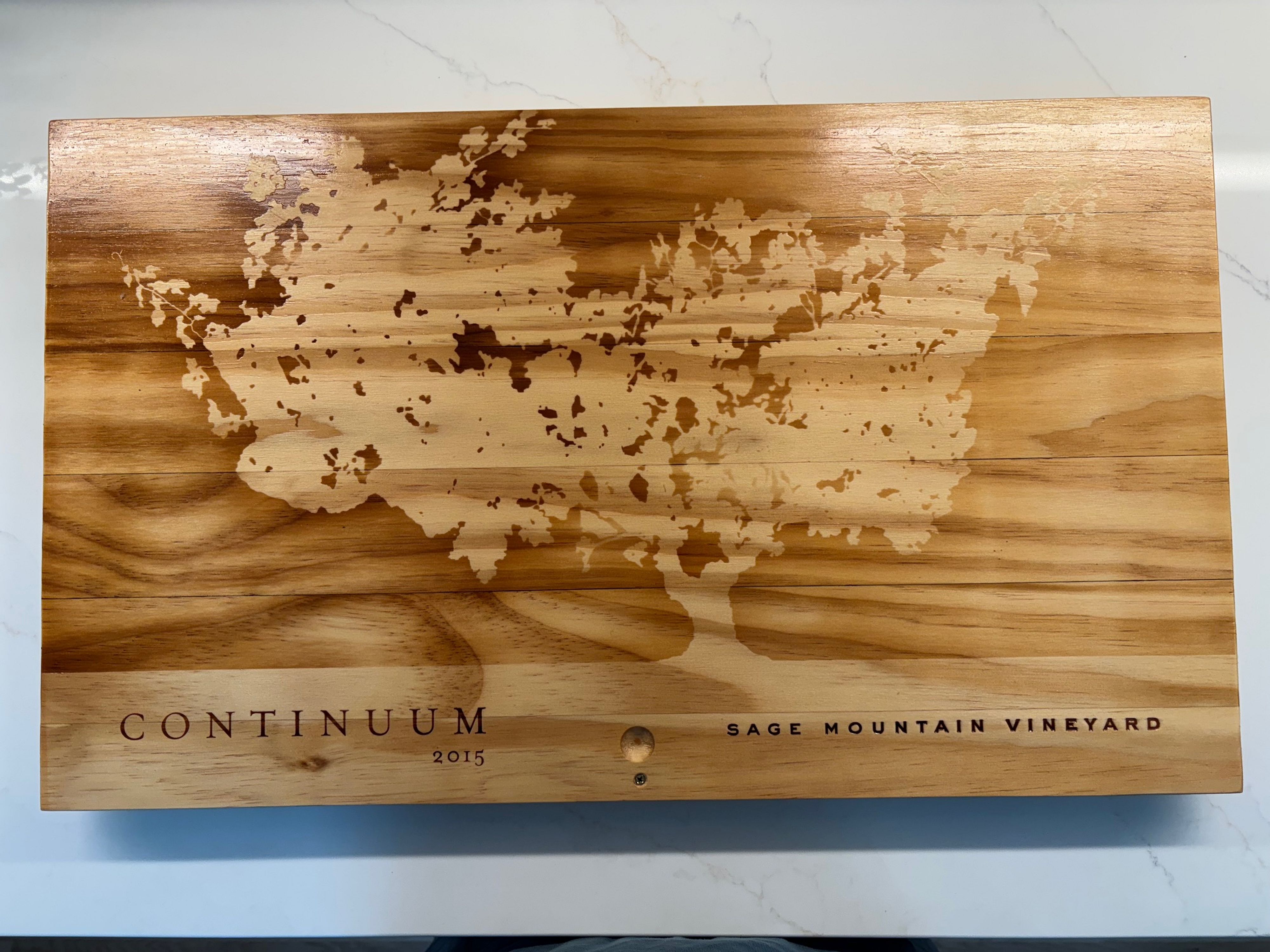 This 2015 Continuum charcuterie board is perfect for a party. The beautiful Continuum Winery logo of an oak tree is on full display on the board which highlights the Sage Mountain Vineyard.