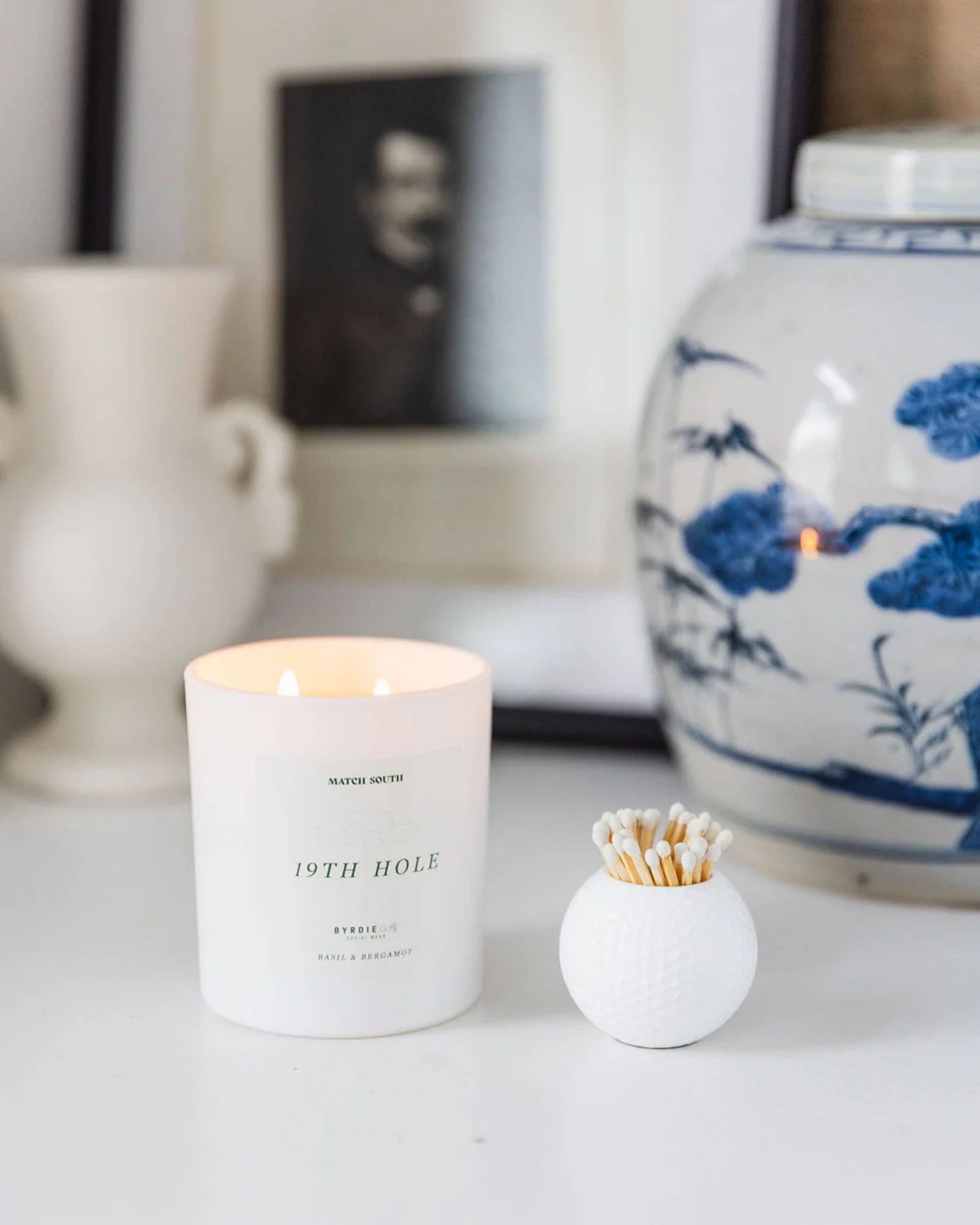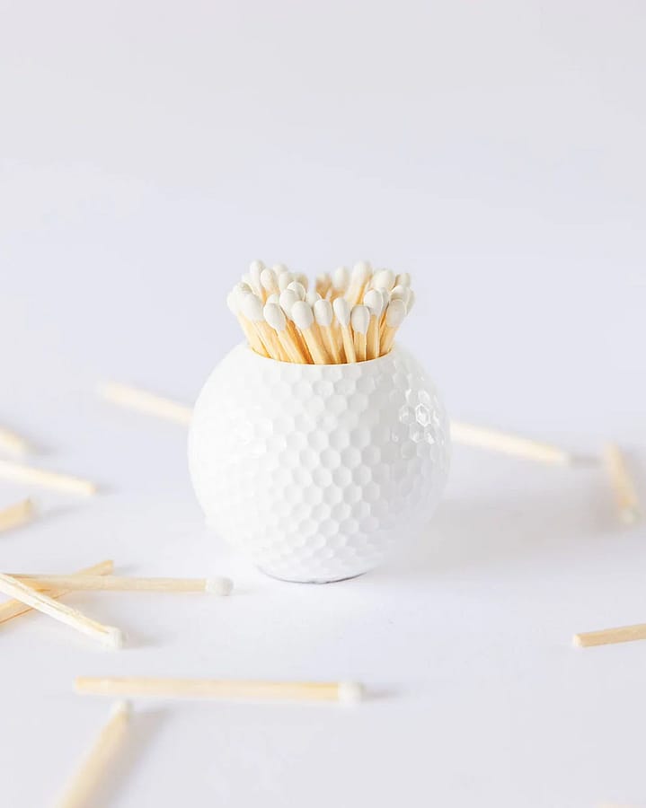 Store and strike matches with style. This vintage-inspired golf ball match holder includes matches that are easily lit with a strike on the bottom of the ball! 1 inch tall 1 3/4in diameter