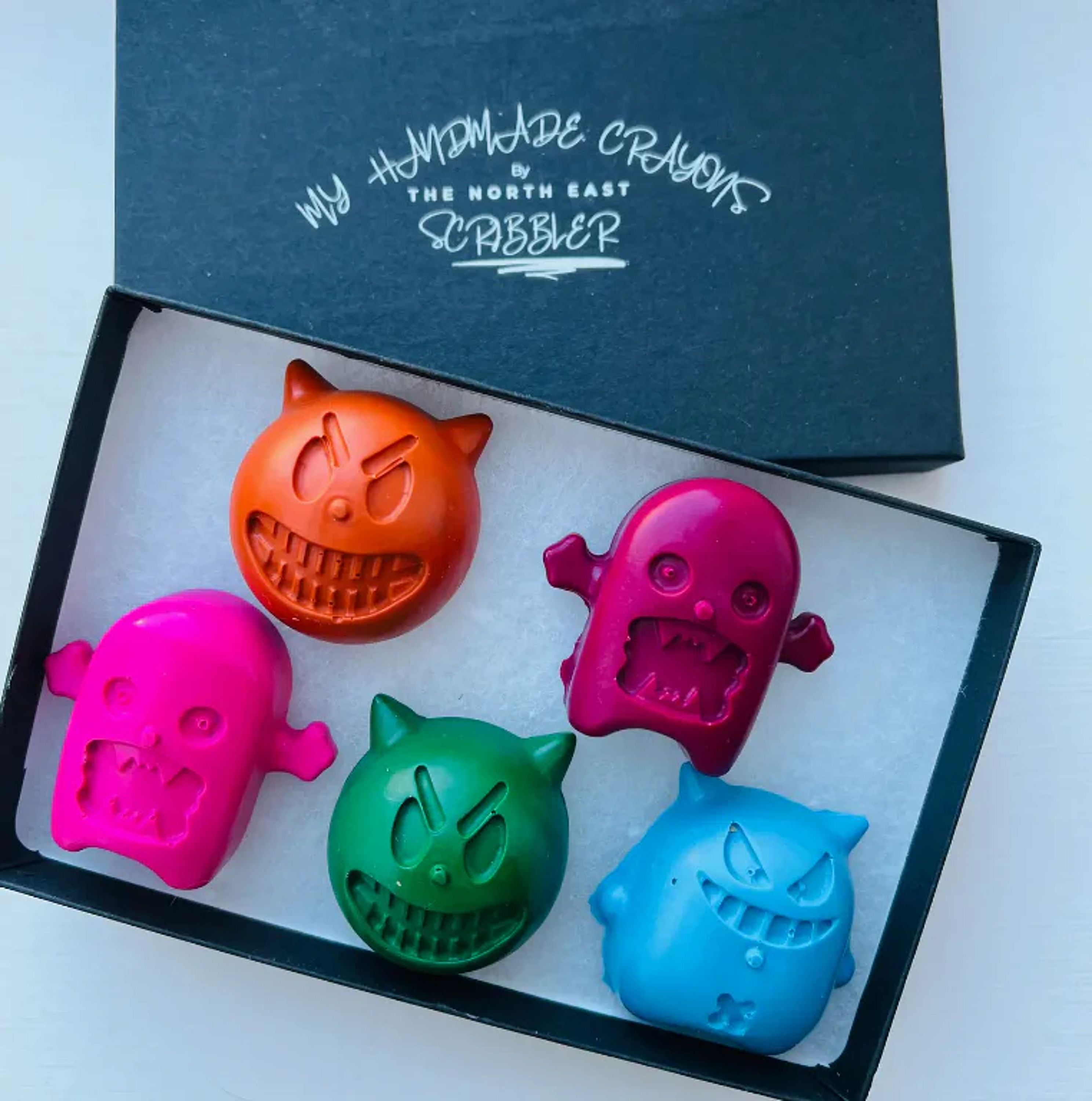 A selection of 5 monster shaped, hand poured vibrant wax crayons. These crayons include 3 different styles of monster Beautifully packaged in our Kraft box with branding add a keepsake colouring bag or Scribble pad for the perfect gift! Colours in each pack may vary but always compliment. They are hand poured from high quality, non-toxic, UKCA certified wax.