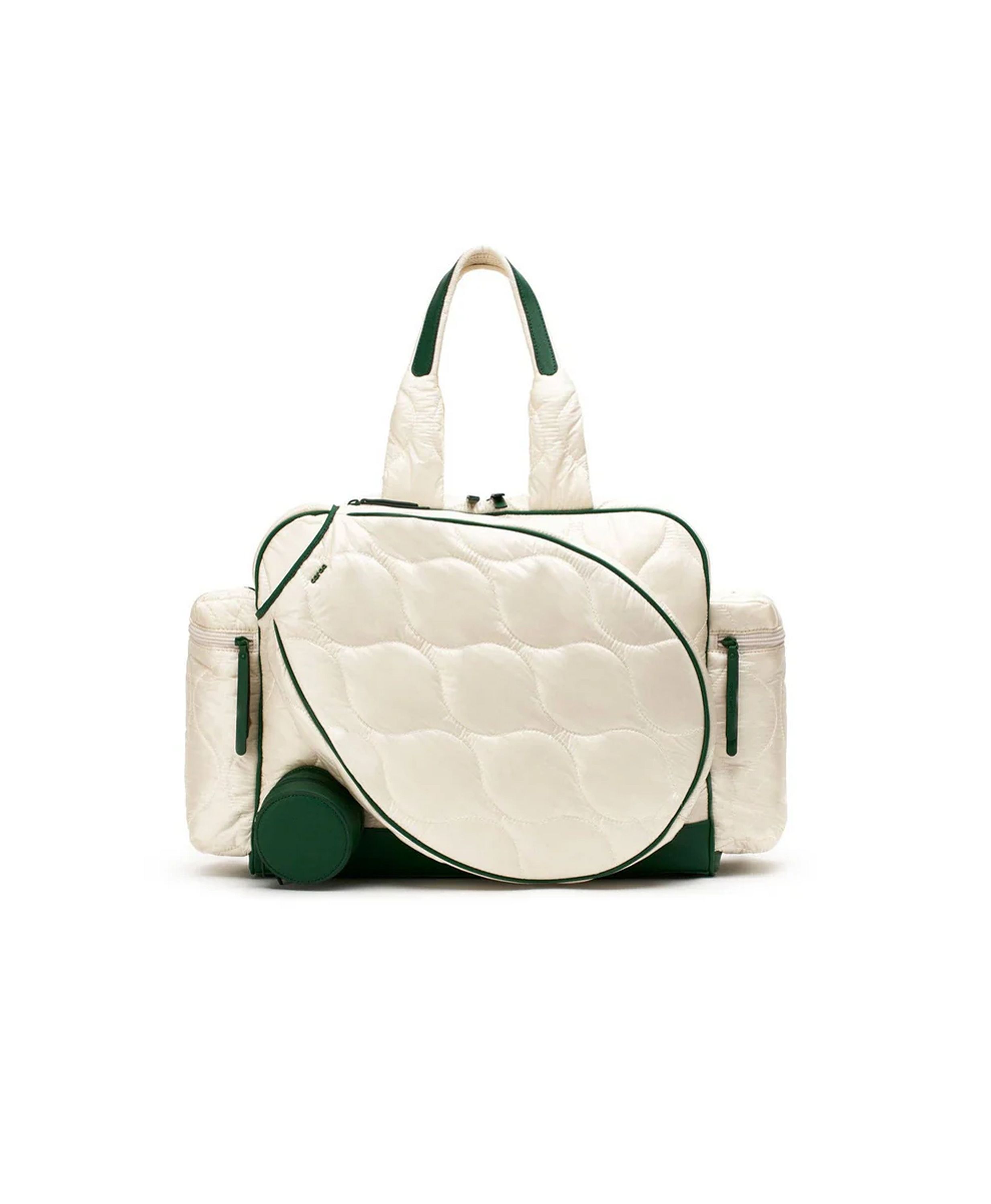 The Tennis Quilted Duffel is a lightweight convertible with dedicated compartments for racquets and balls. Sporty, streamlined, and vegan-friendly. Insulated pocket that fits 2 racquets 2 stacked tennis ball or water bottle pockets Removable crossbody strap 6 total pockets + compartments Lots of space for a big towel and sneakers Tennis ball pocket detail.