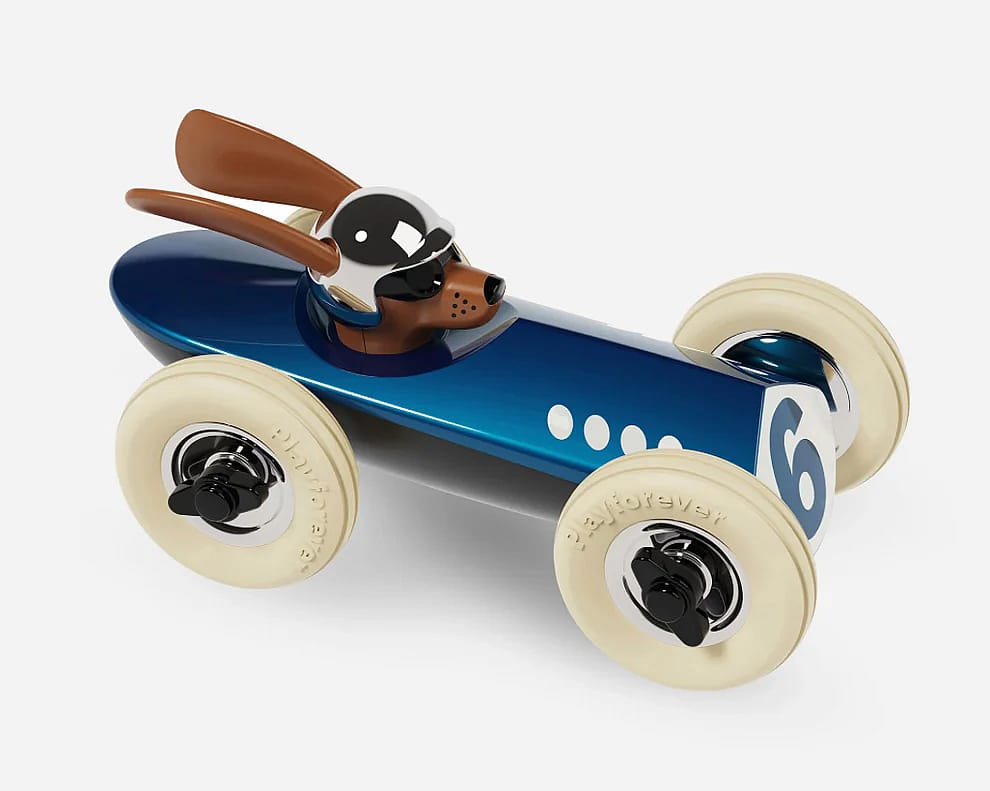 The Rufus collection is designed and made by Playforever, following their recent collaboration with Hugo Boss. A streamlined shape with a geometric front and pointed 'ridge' on the bonnet top, smoothing out to a rounded form at the back, this car means business - and SPEED! I mean, those dogs' ears say it all.