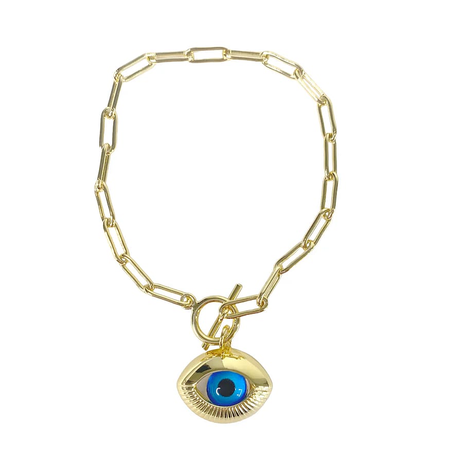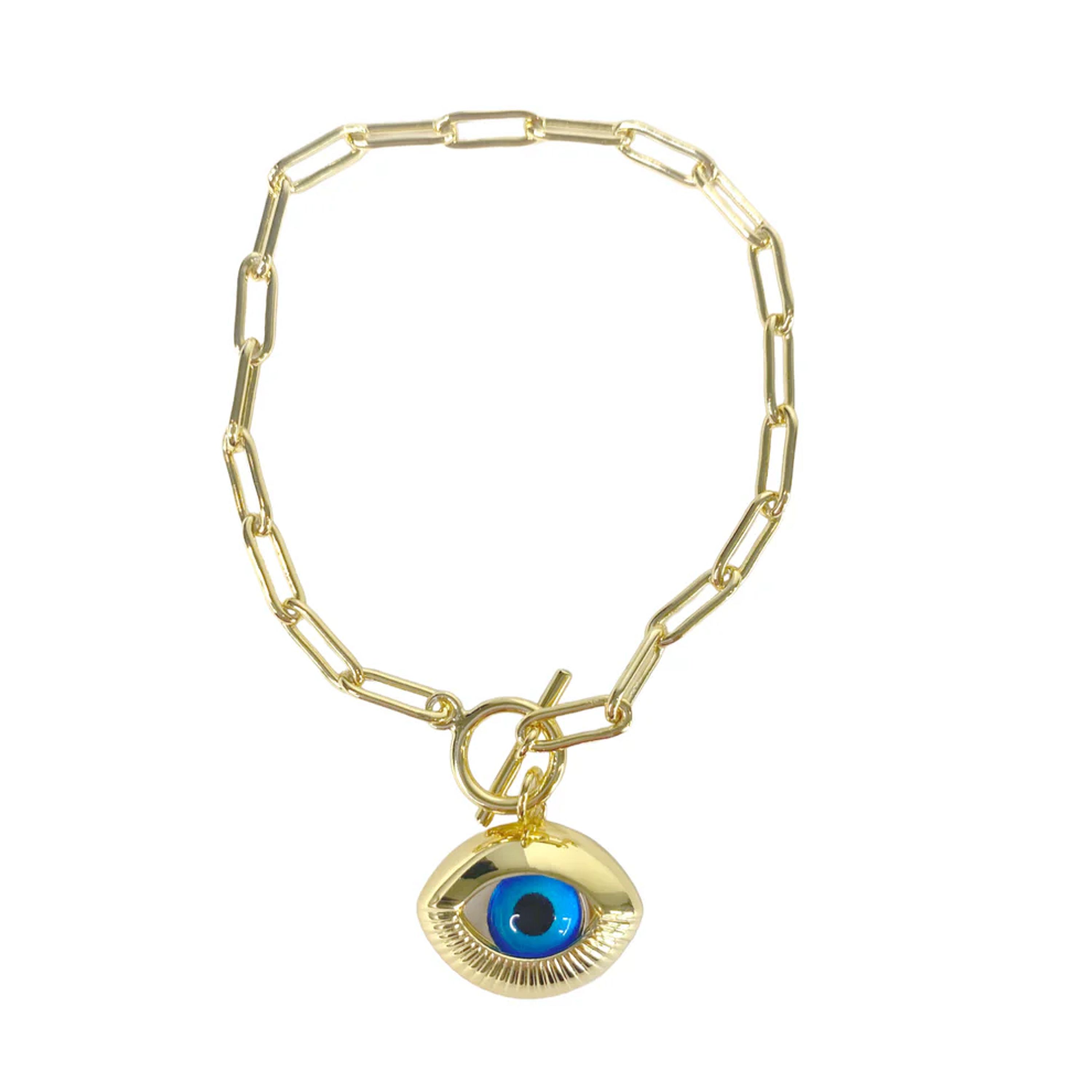 18k gold plated 925 sterling silver bracelet with an evil eye pendant. Pendant size: 20mm W 10mm H