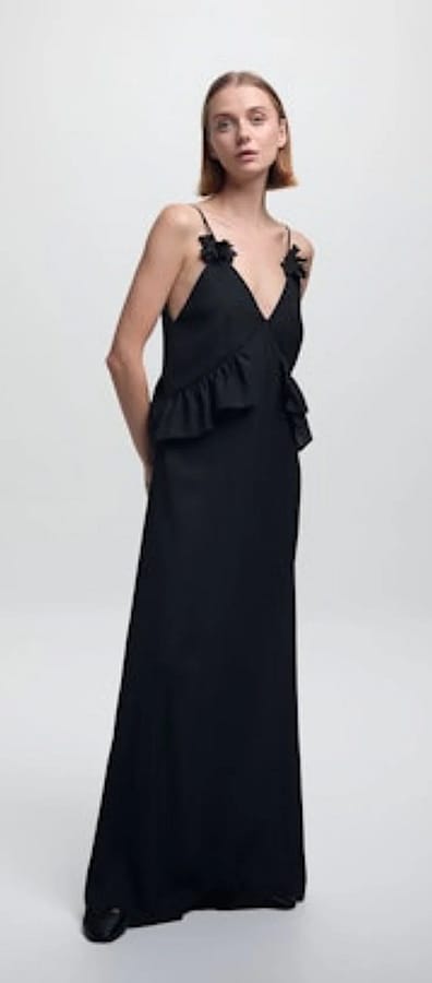 Maxi dress with plunging neckline, straps, ruffle and hand-made flower appliqués, in crepe.