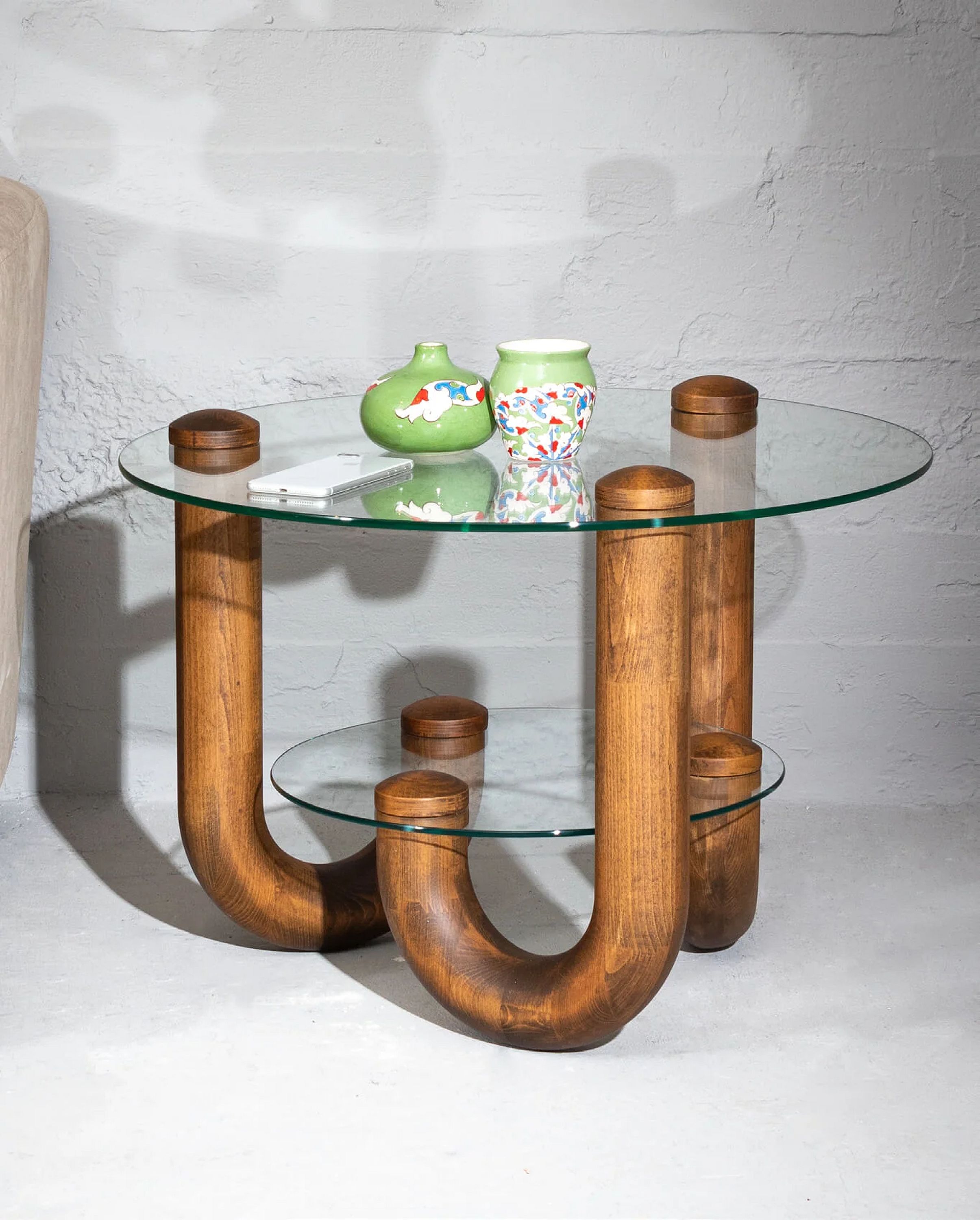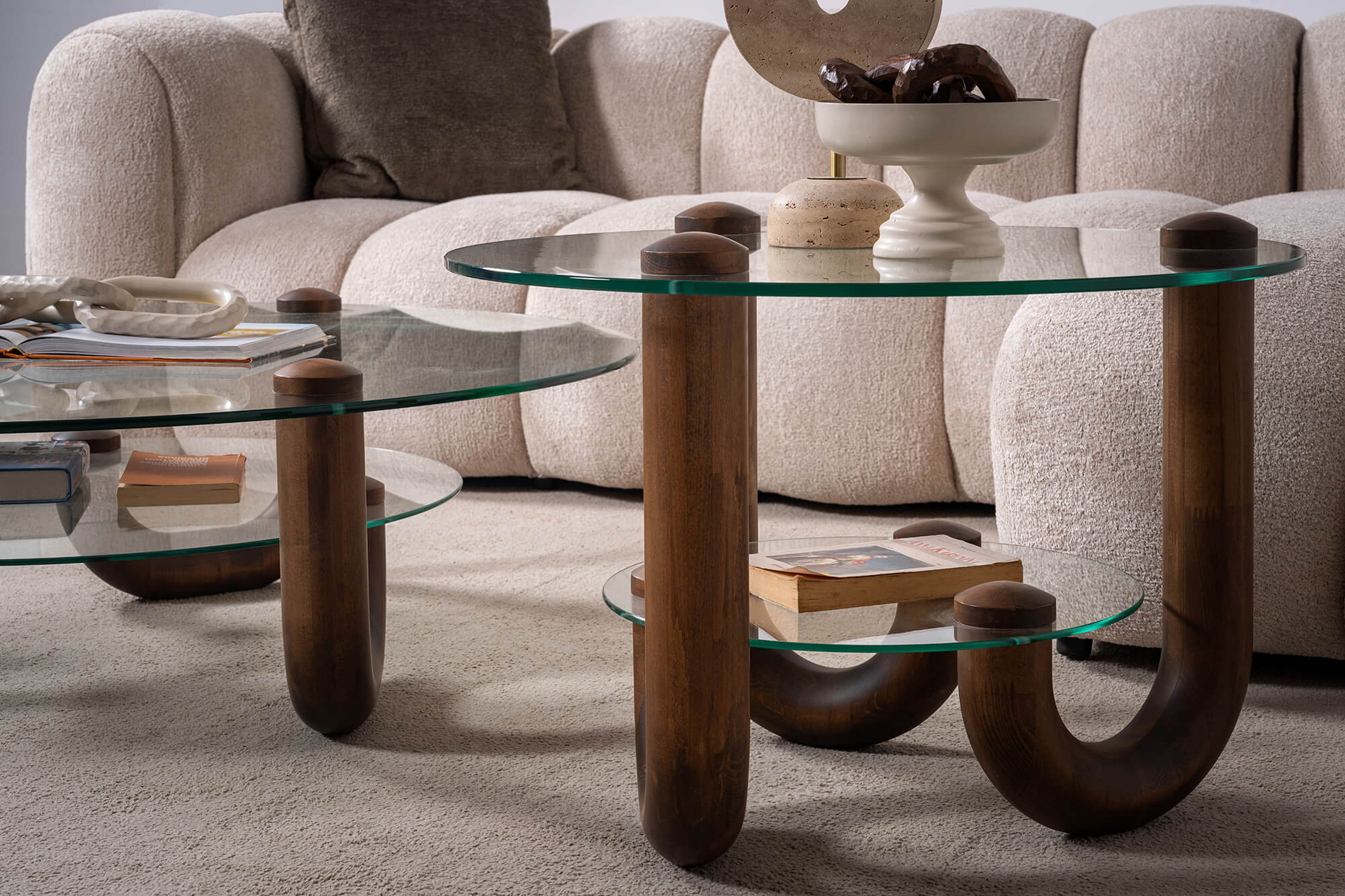 Defined by its curved wooden legs and dual glass tops, the Elle Side Table is a bold yet refined statement piece. Its sculptural silhouette and layered design bring both function and modern elegance into any living space.