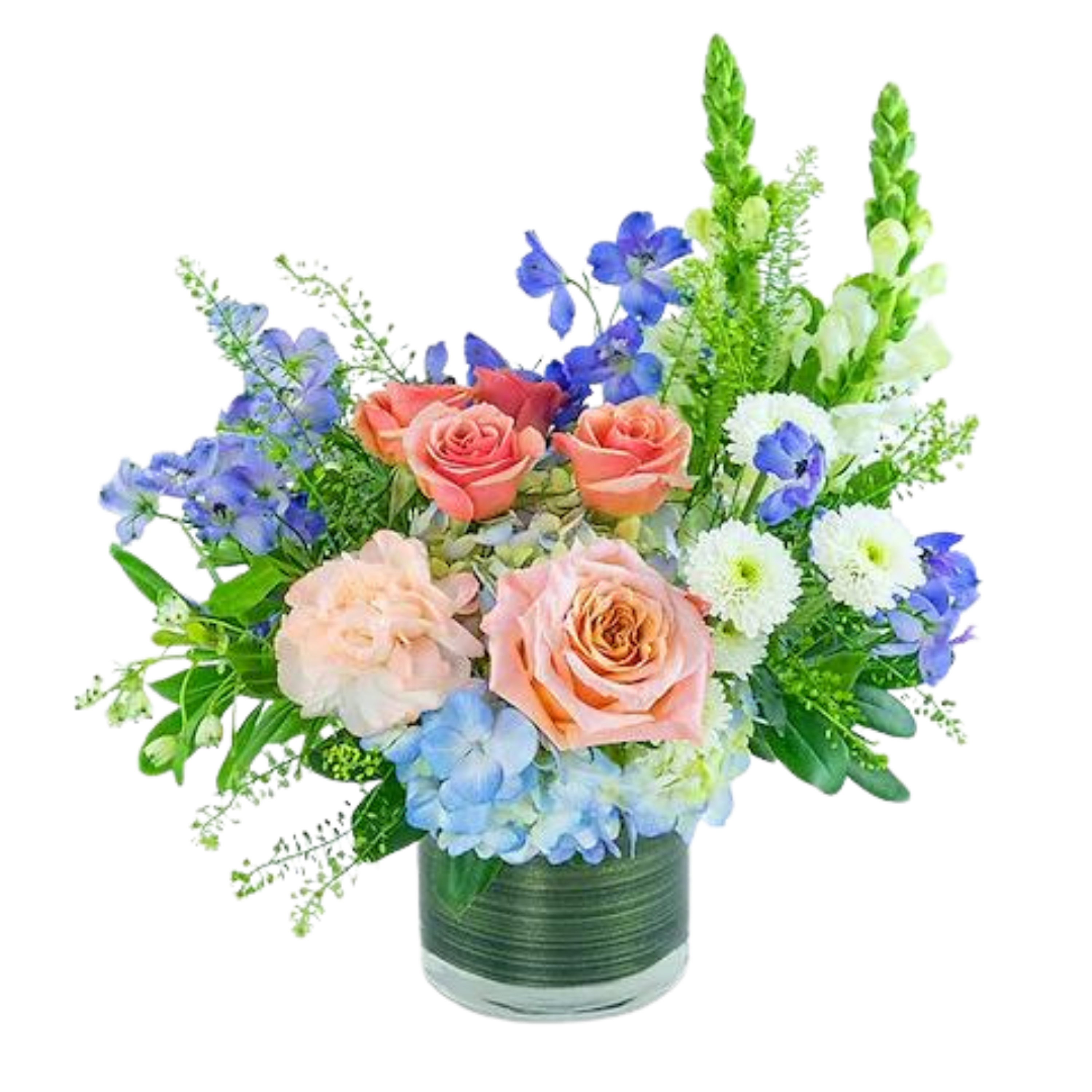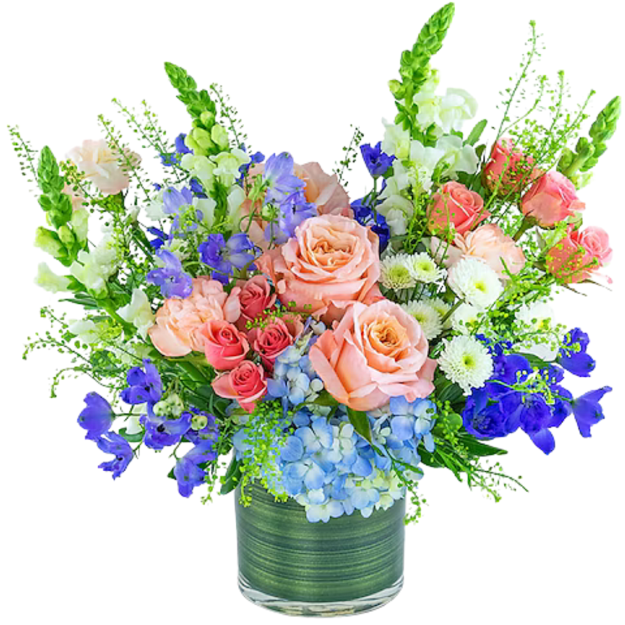 This breathtaking arrangement of peach and blue blossoms features a delightful combination of Roses, Delphinium, Carnations, Mums, Hydrangea, Snapdragons, and premium foliage. Expertly arranged in a leaf-lined cylinder vase,