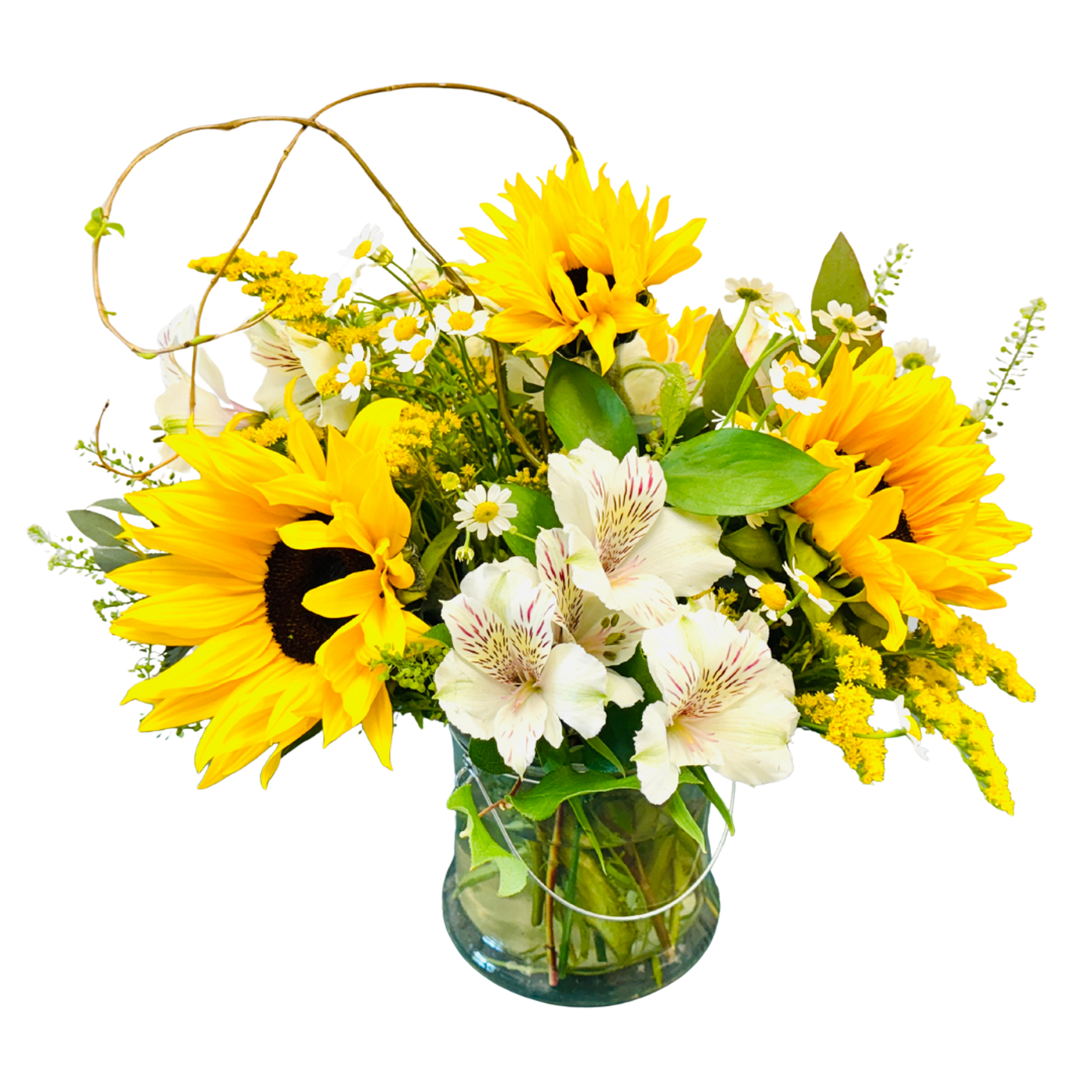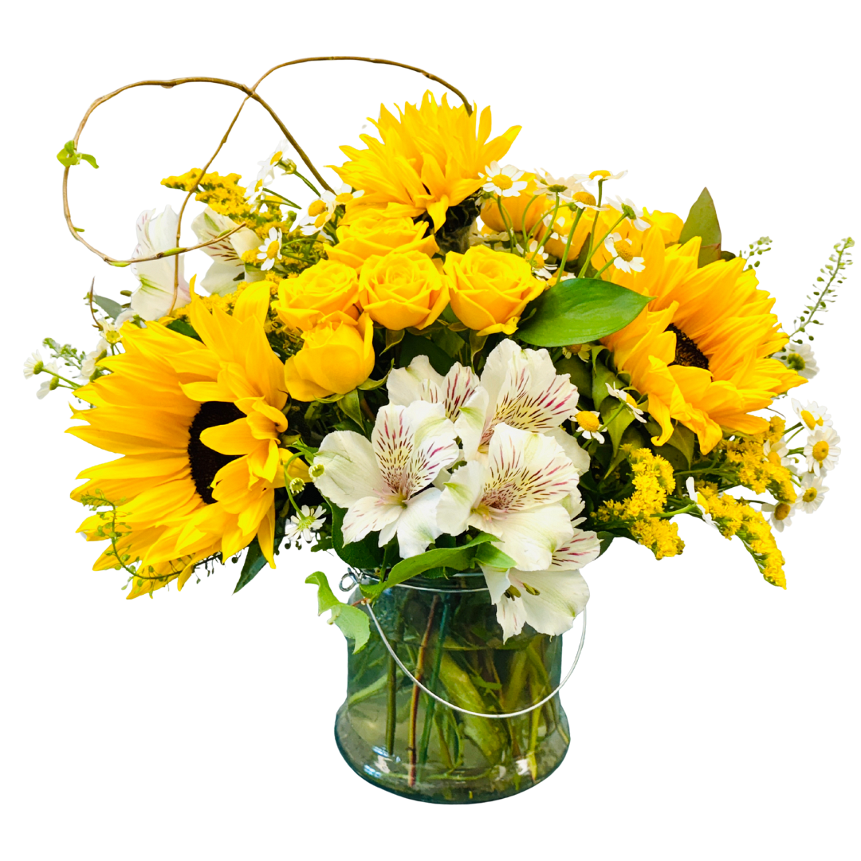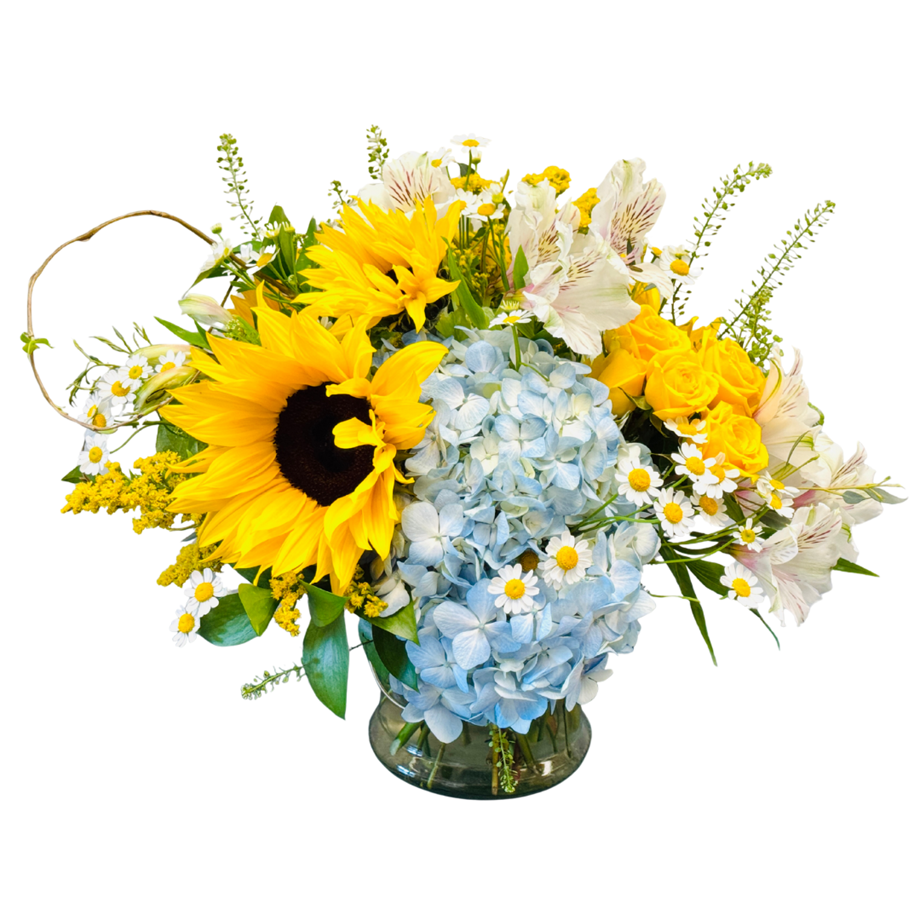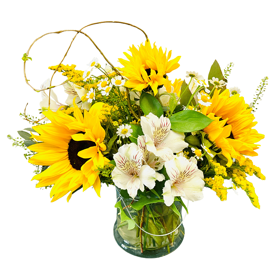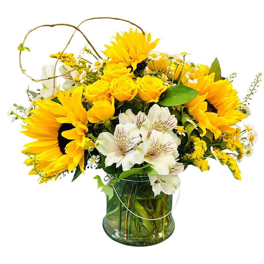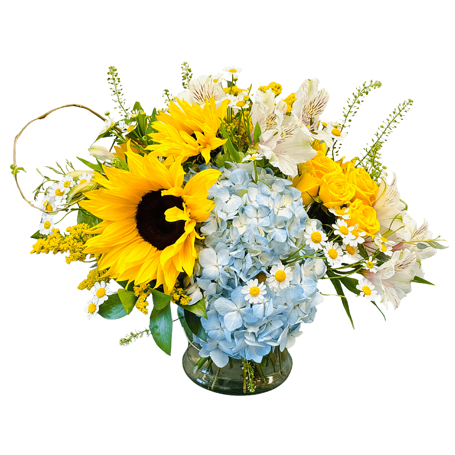 Description: Hello Sunshine, Designed in a clear glass vase, includes sunflowers and alstroemeria. Better size adds in some spray roses, and the best size includes sunflowers, alstroemeria, spray roses and hydrangeas.