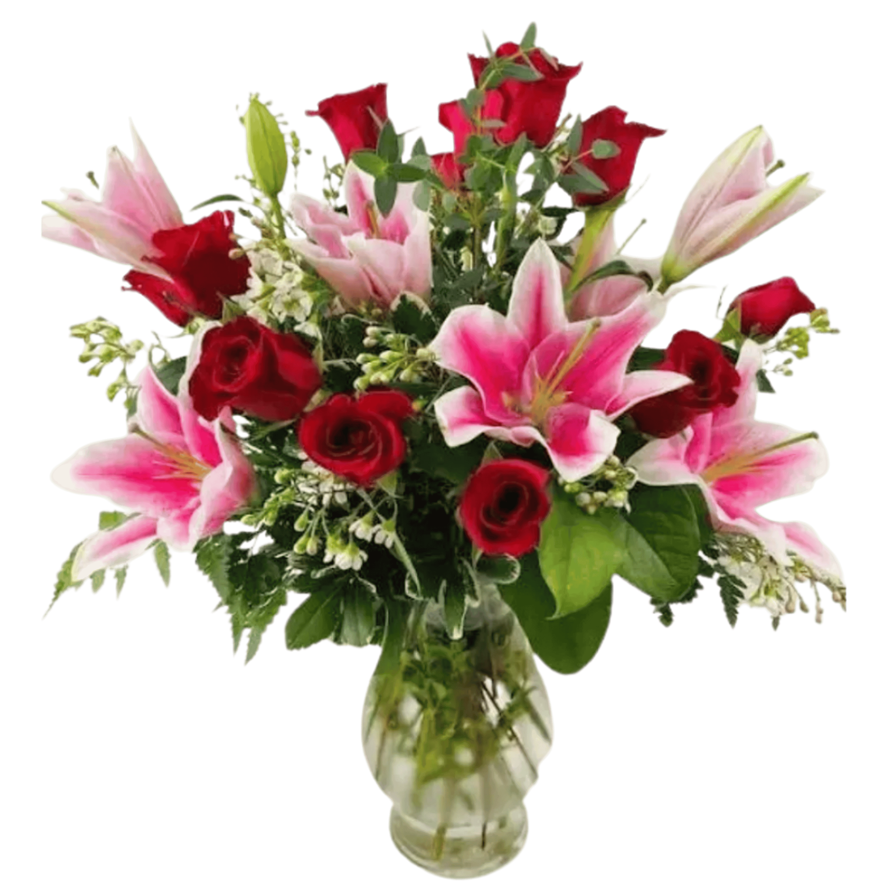 Red roses and fragrant lilies speak timeless beauty. Designed in a clear glass vase with Red roses and pink oriental lilies. Orientation - All Around